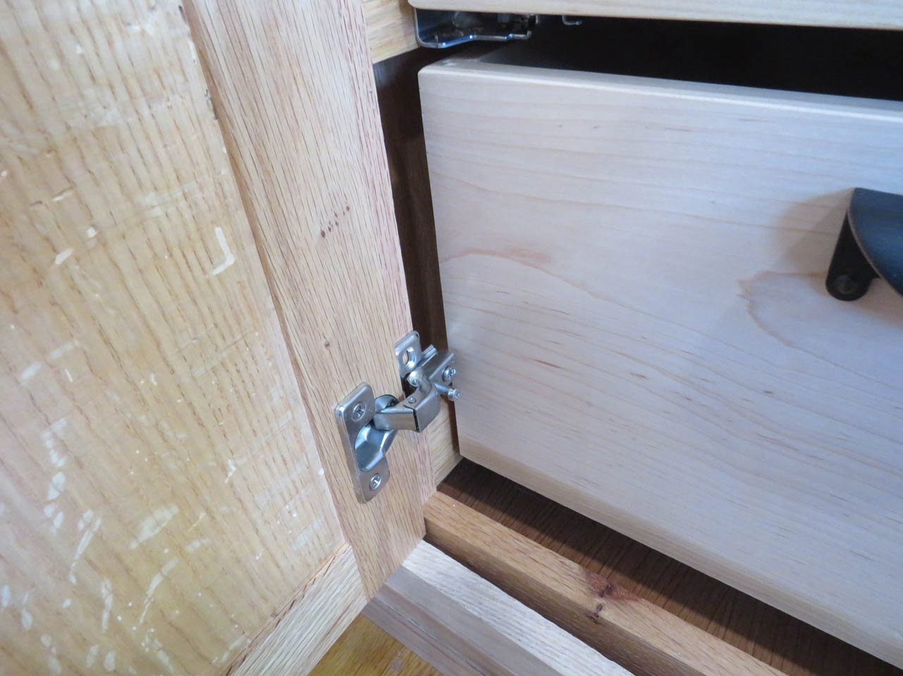 I looked around my shop for all of the different types of hinges that I have had left-over from many projects over the years. I found some Blum soft-close hinges that work similar to the hinges I had except they pull themselves closed by the soft-close mechanism.