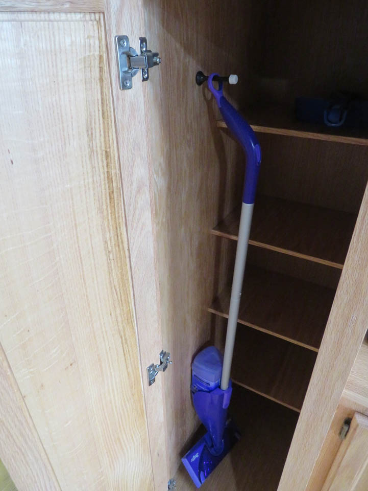 They worked pretty well. I drilled a hole in the broom handle and tied a loop of string to it, to hang on the right side. The shelves in the back can hold the dust pan, and additional supplies for the mops.