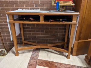 My next project for Holy Spirit church is a series of tables. They will all be modeled in part around the design of this existing credence table (see image below). These new tables Will have the shelf placed lower, which will remove the need for the brace at the bottom. The center column is decorative so, to allow for more storage on the shelf, that will be removed from these tables as well. Every other component of the table will be duplicated so that they will all resemble the original table.