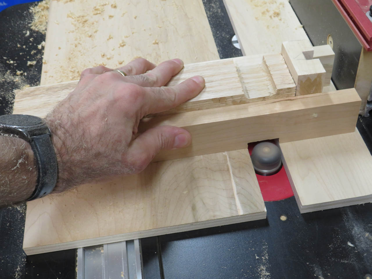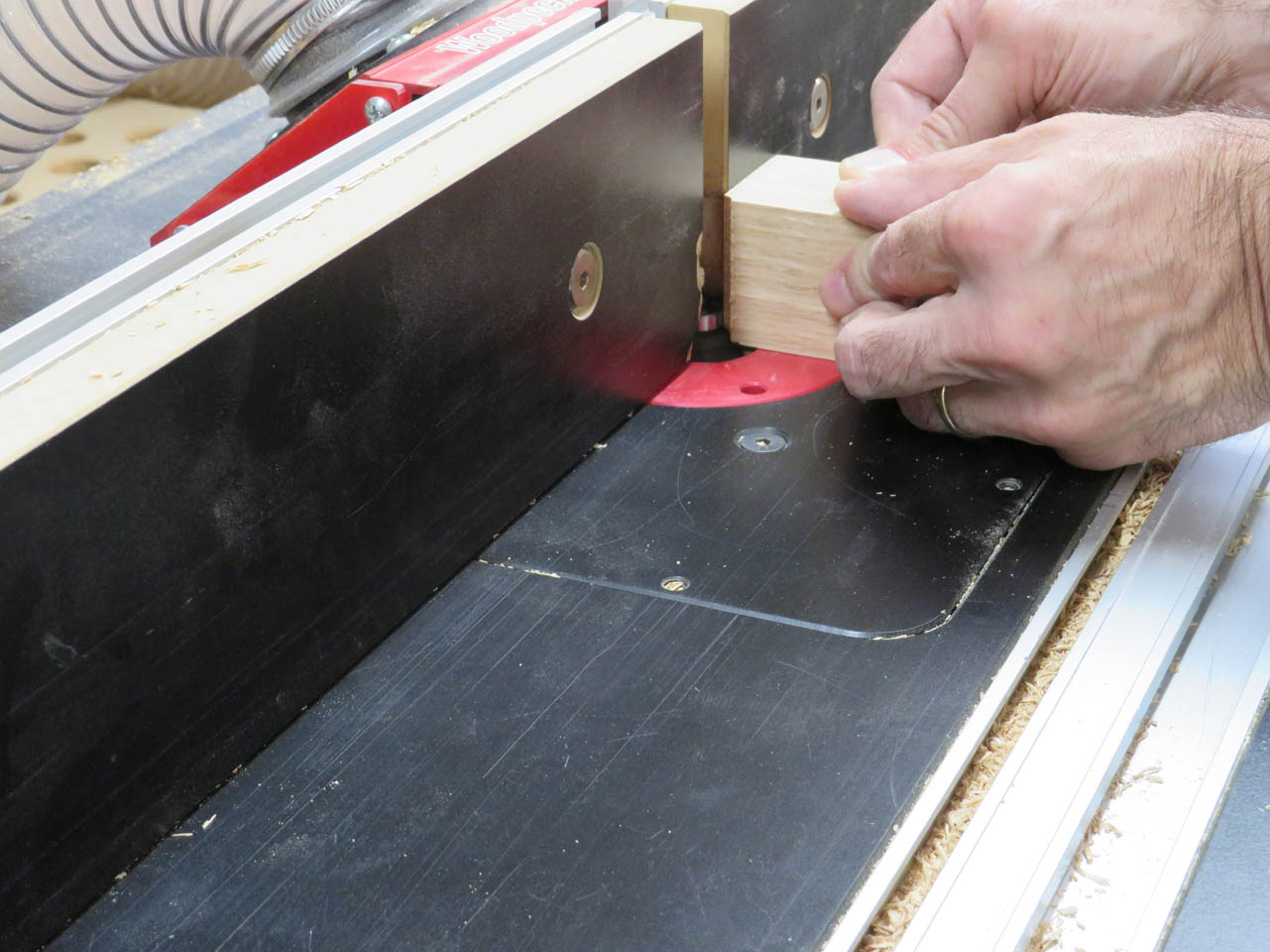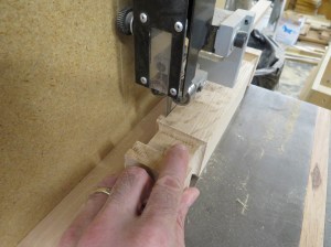 Next, I carefully run the drilled face across an ogee bit on the router table to mimic the cove in the top of the foot that was on the original.