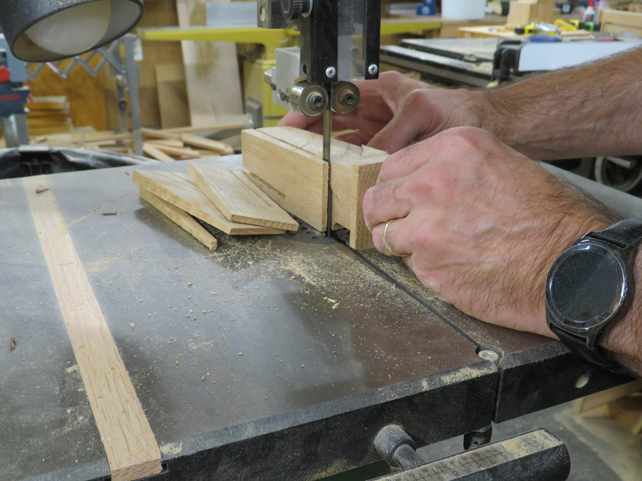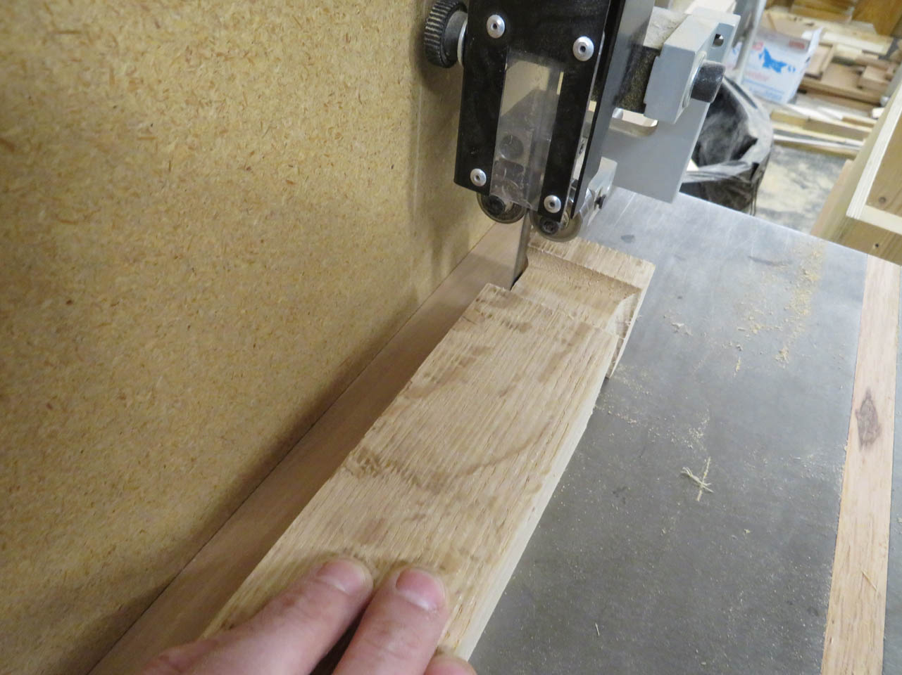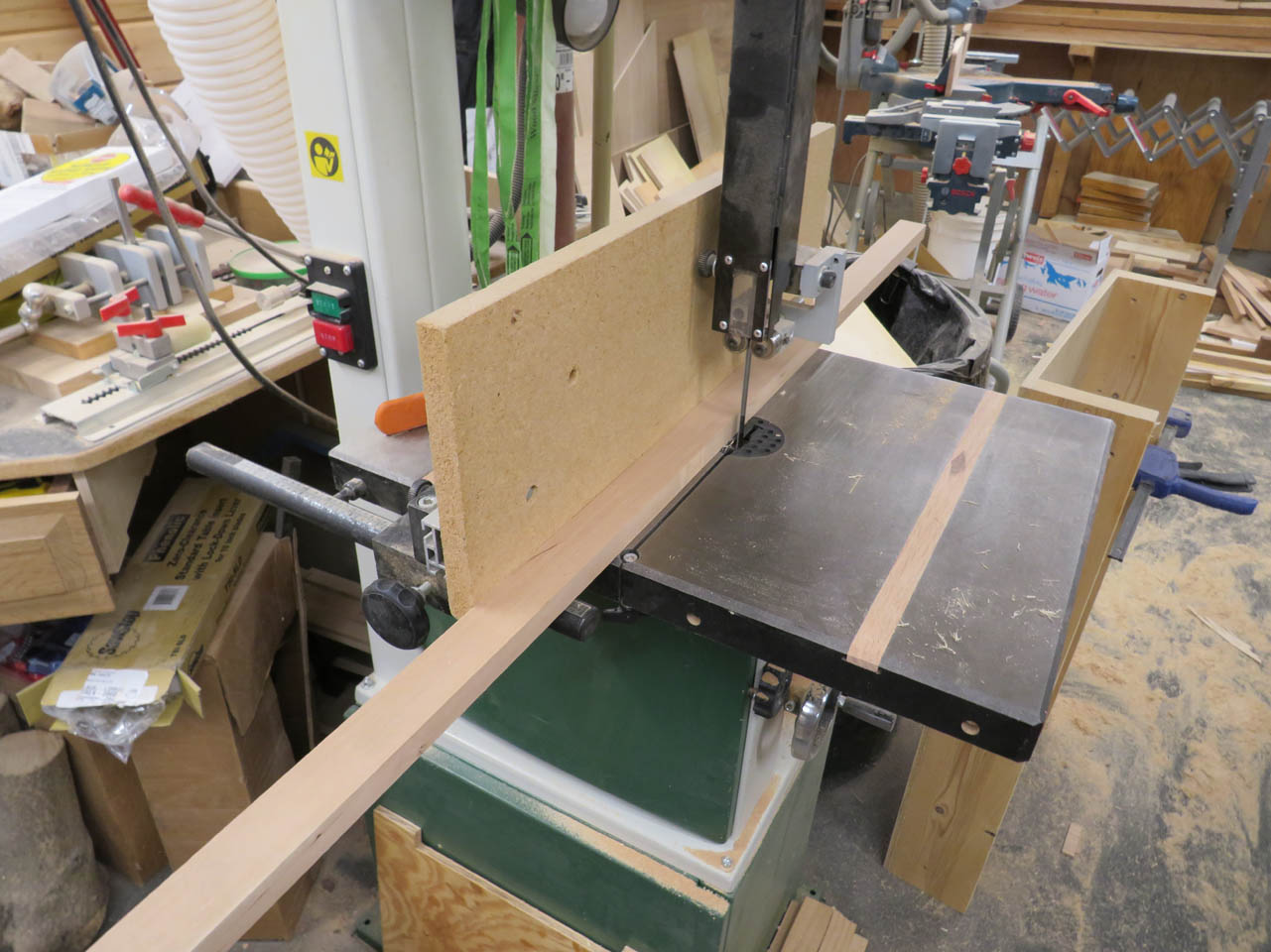 To cut away the majority of the waste in the middle, I set up a 1/2″ re-saw blade in my bandsaw, then added a small strip of wood to the fence.