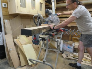 Then I used my cross-cut sled to cut the columns to length. Actually, I cut them 1″ longer than the column height to create an additional tenon on each end later.