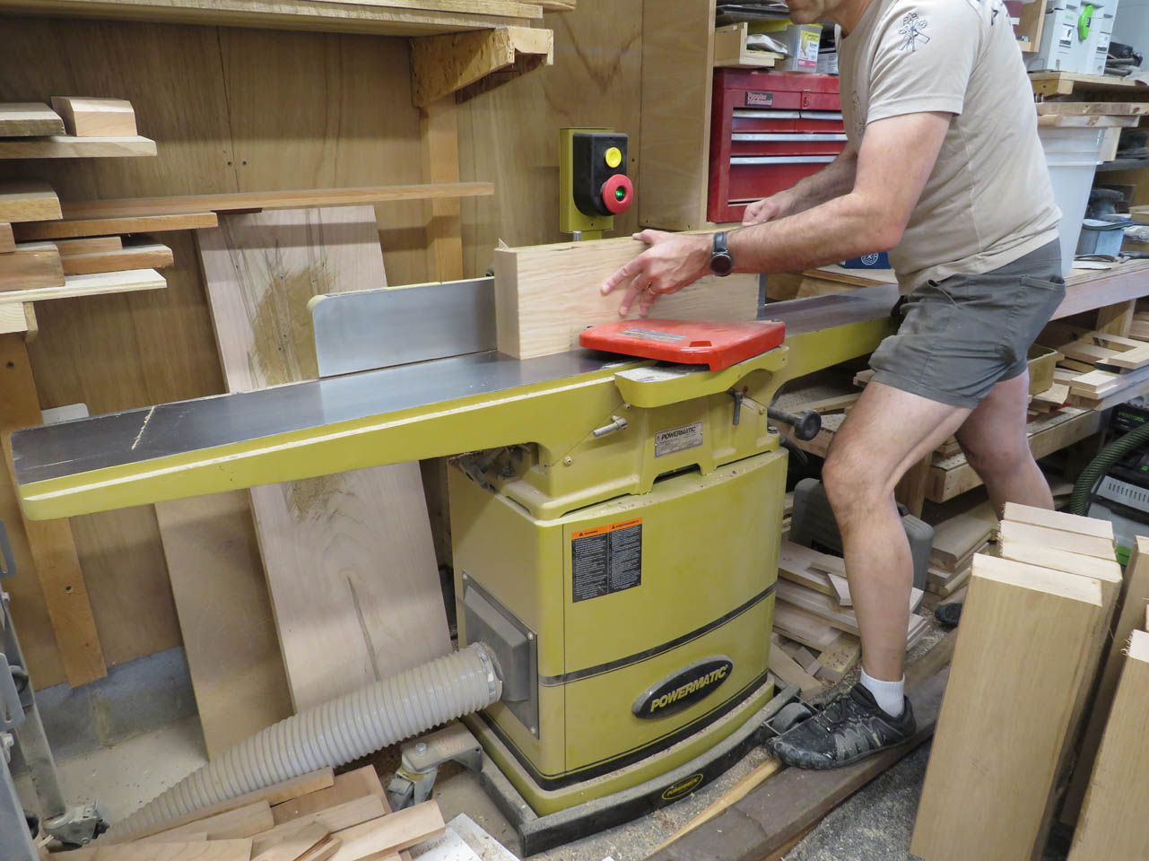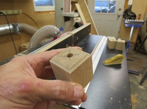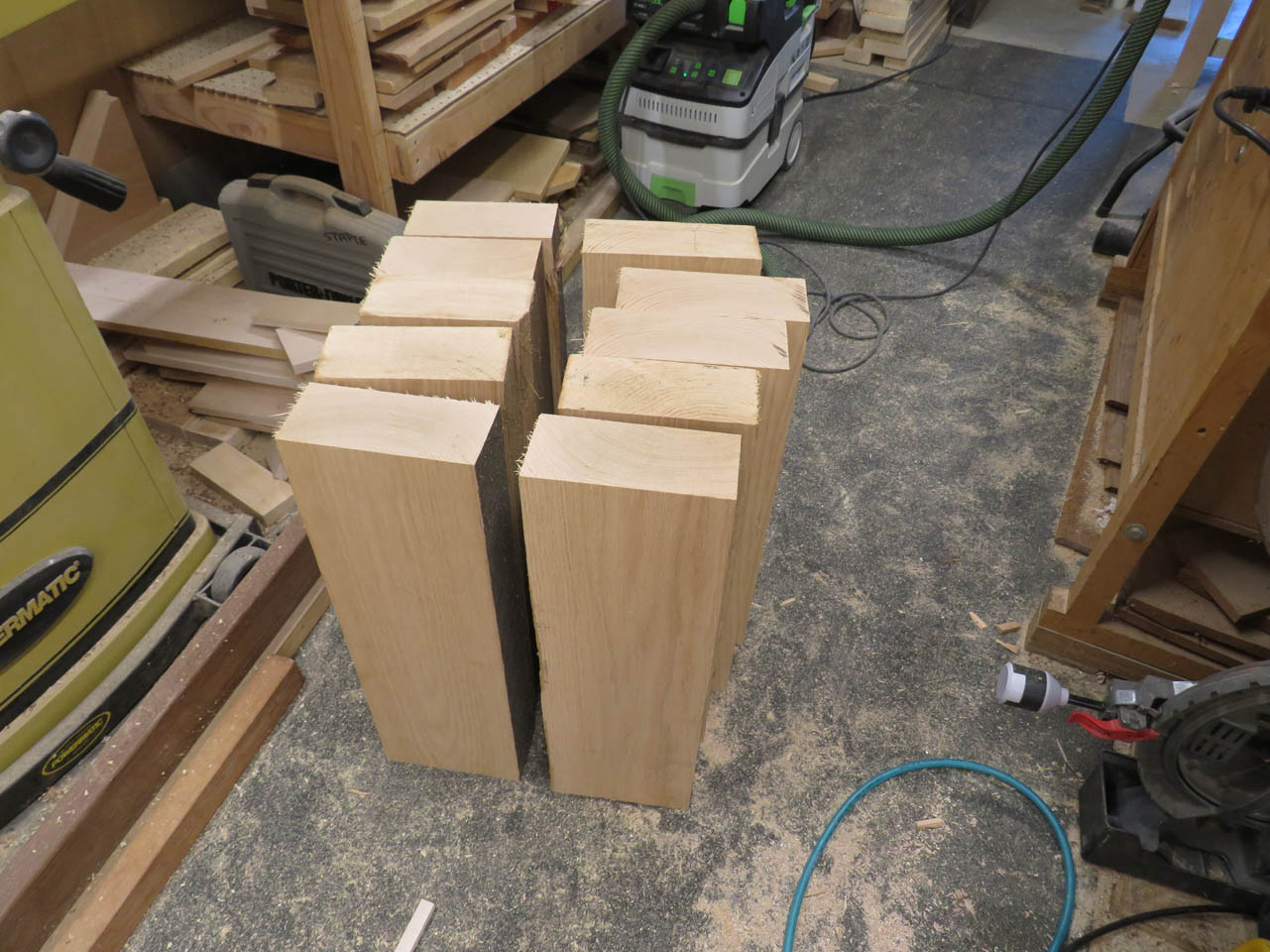 This is the method I finally settled on. First, I planed, jointed, and cut some of my 3″ stock down to 2-1/4″ square blanks.