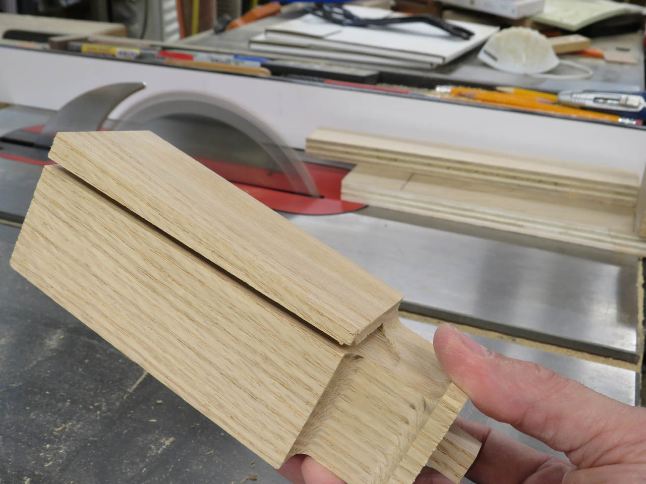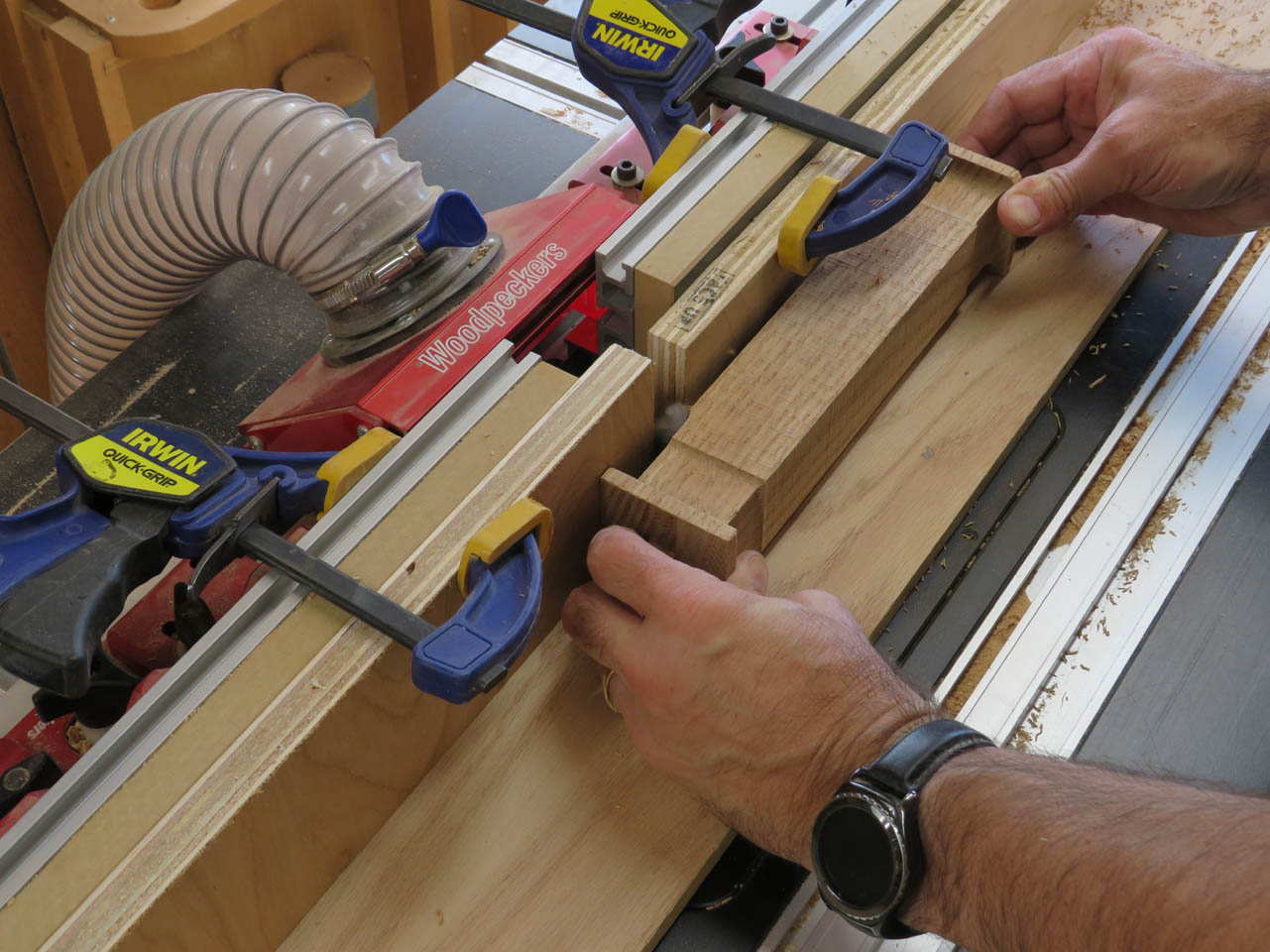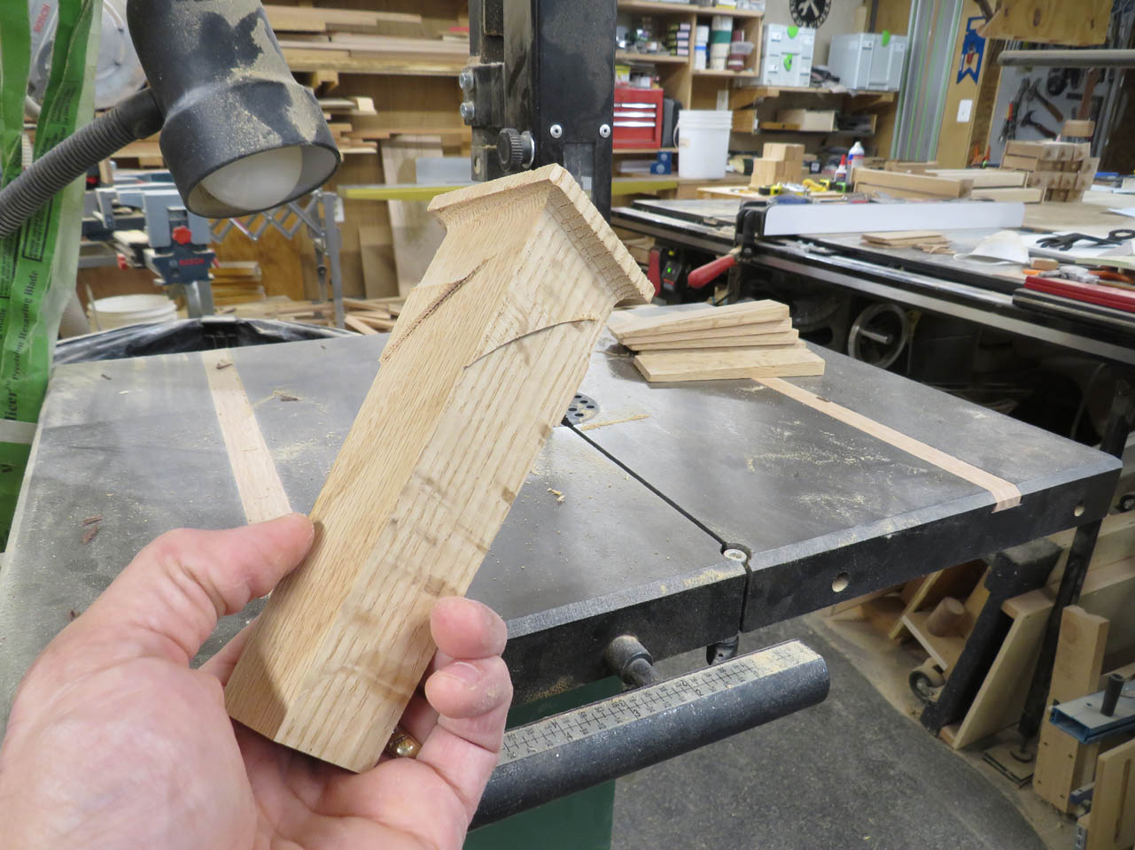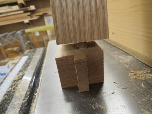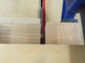 I use 1/8″ offcuts to create shims to hold the blank at the same size and stabilize the faces as I cut. The oak gets a little springy and my cuts may be off otherwise.