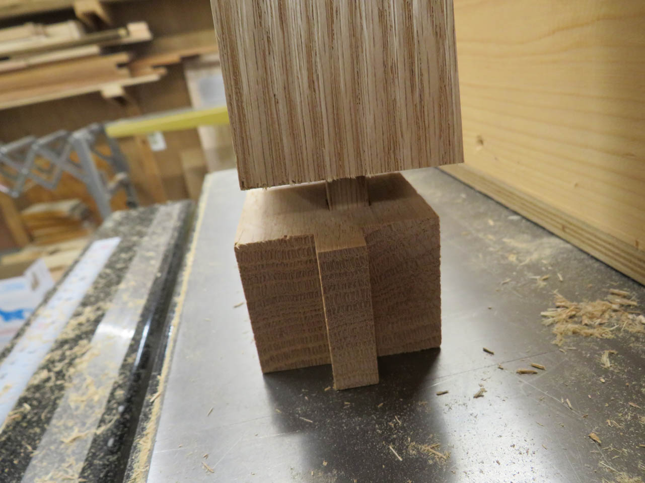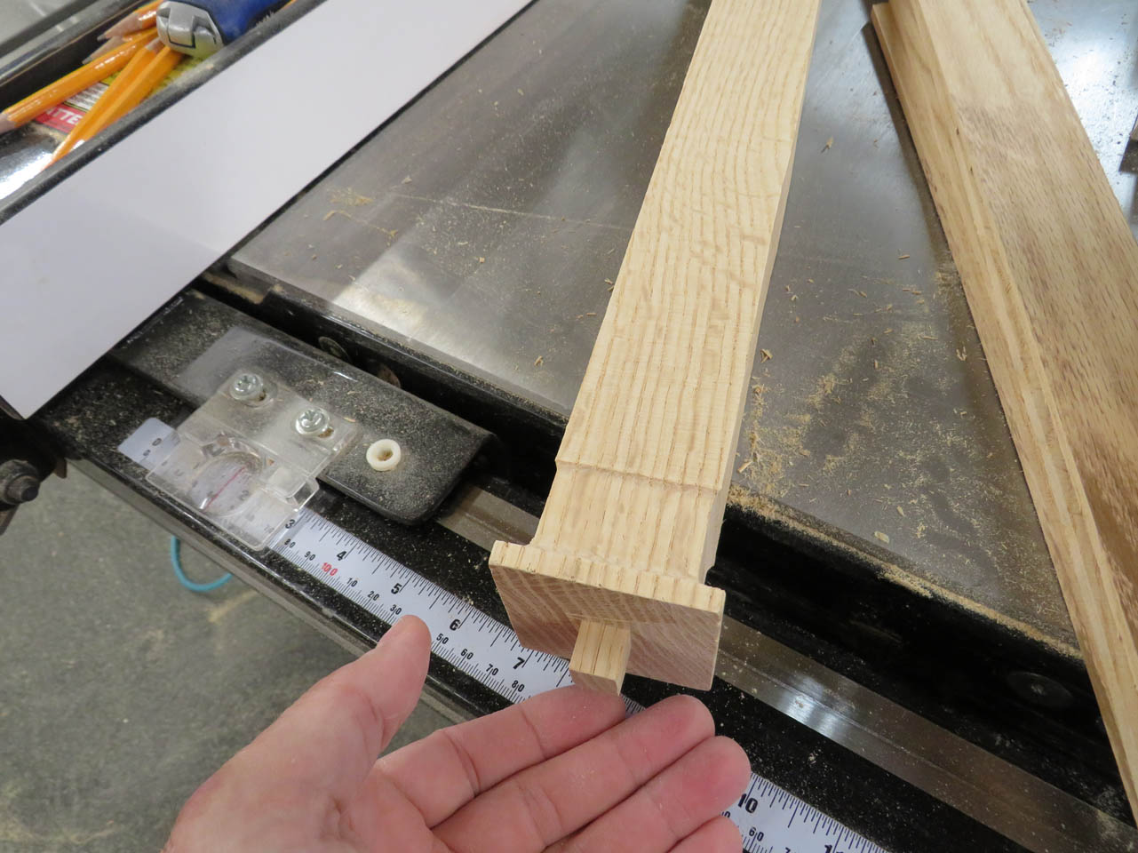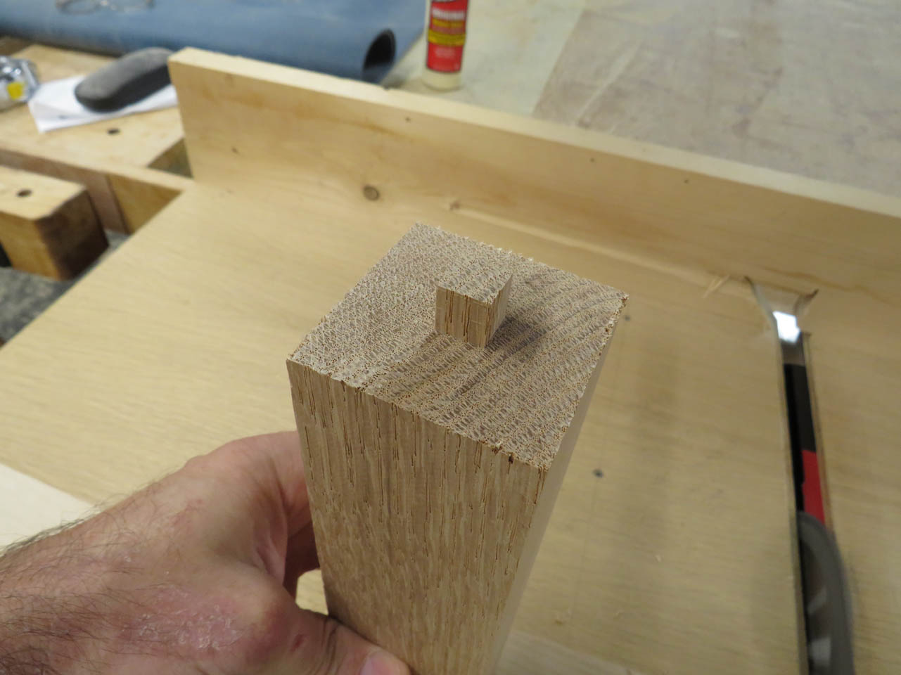 To help greatly with assembly and alignment, I decided to cut a small 1/2″ x 1/2″ x 1/2″ tenon onto the end of each leg and column.