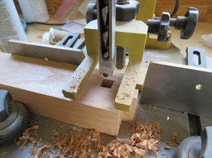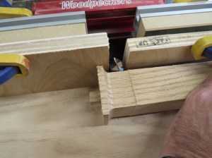 My plan is to make up the panels for the tops and the shelves, then drill a square 1/2″ hole into each corner at my mortiser. I drilled out a sample mortise on a scrap to test the fit.