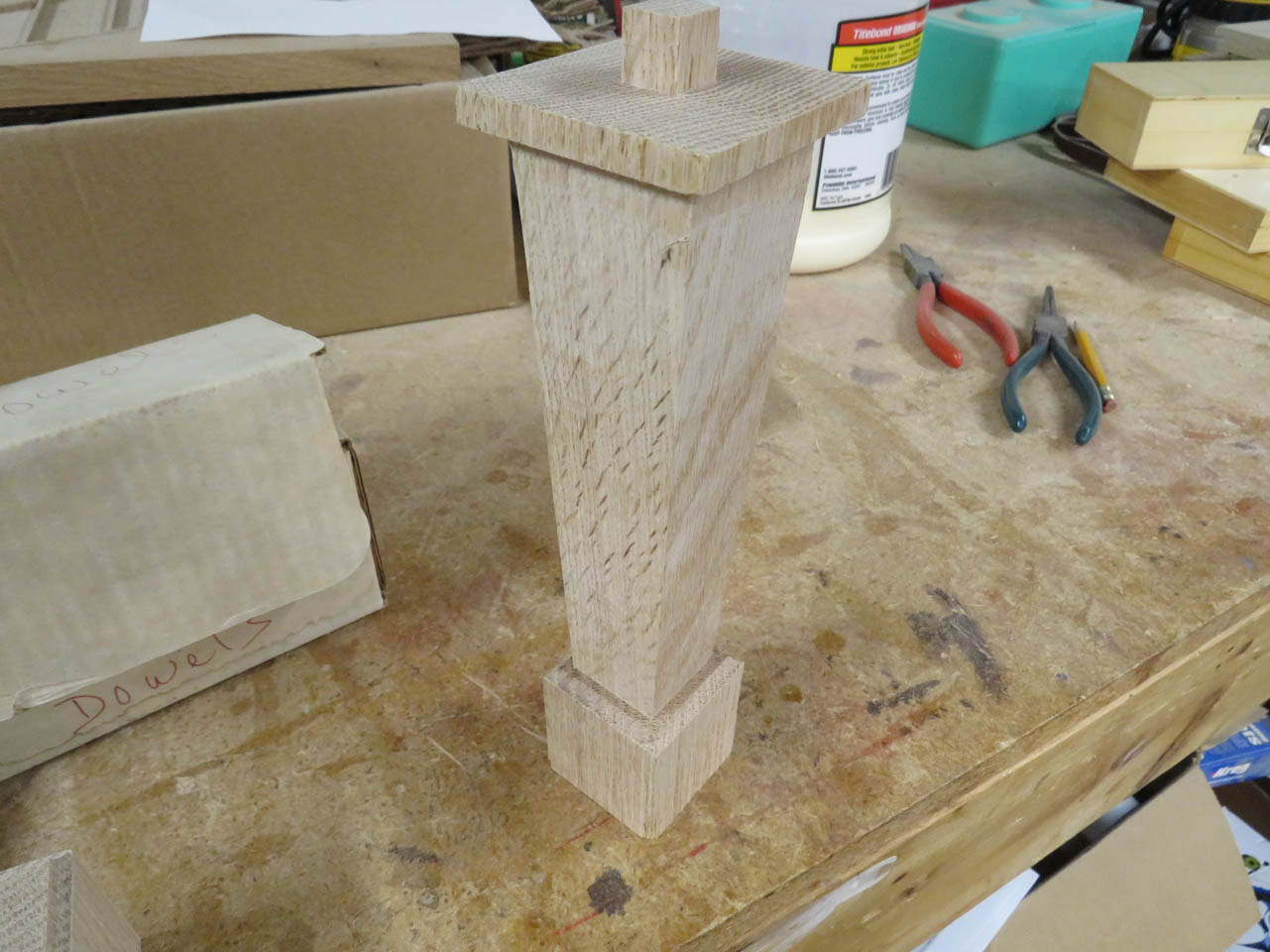 I am starting with a pile of 12/4 (3″ thick) oak and a pile of 5/4 (1″ thick) quarter-sawn oak. I believe the legs and columns will be the most difficult to reproduce so I am starting with them first. I spent about a week experimenting with methods to reproduce the shape of the columns. The 1/4″ radius flared out at the top and bottom were not easy to reproduce.