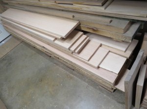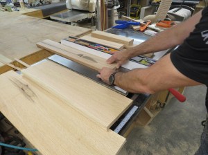 For most of the tops and shelves, I will need to join two pieces so as I pre-cut boards down to the approximate length. I am also matching grain and color.
