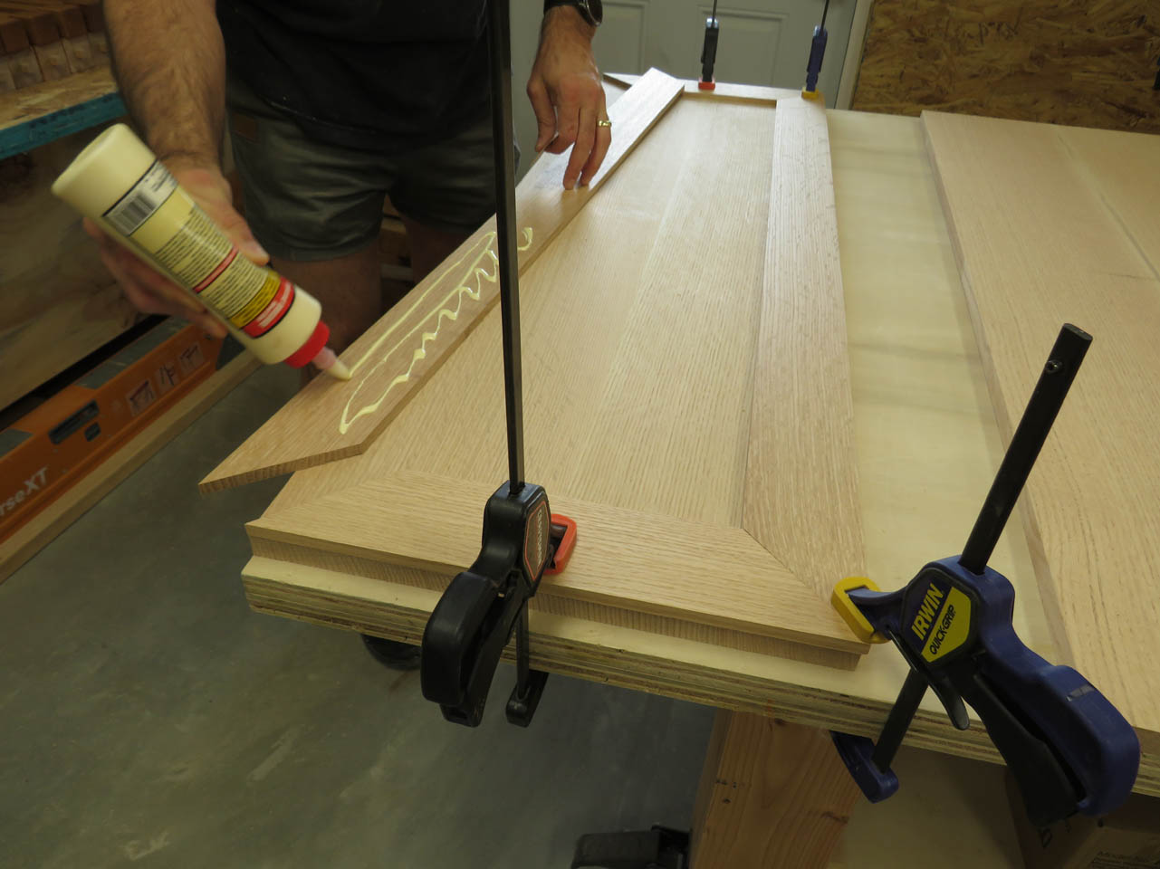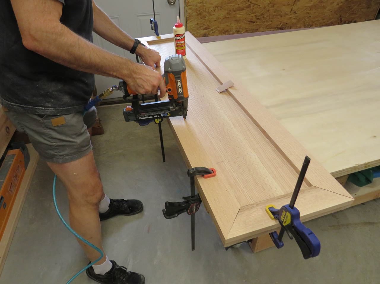 Each strip gets a thin layer of wood glue applied, then gets clamped in place before attaching with 18-gauge brad nails.