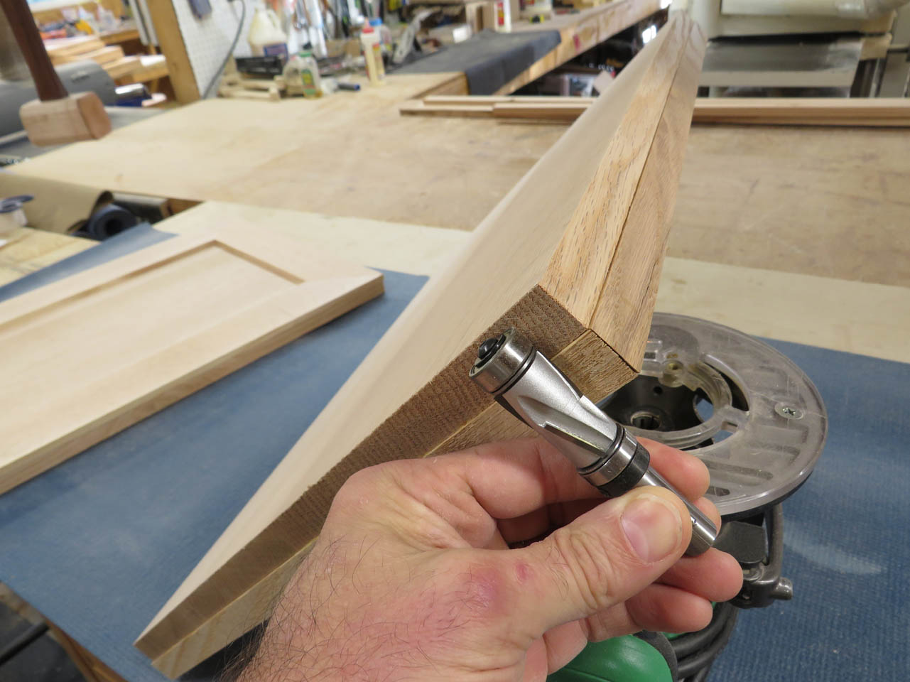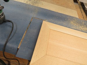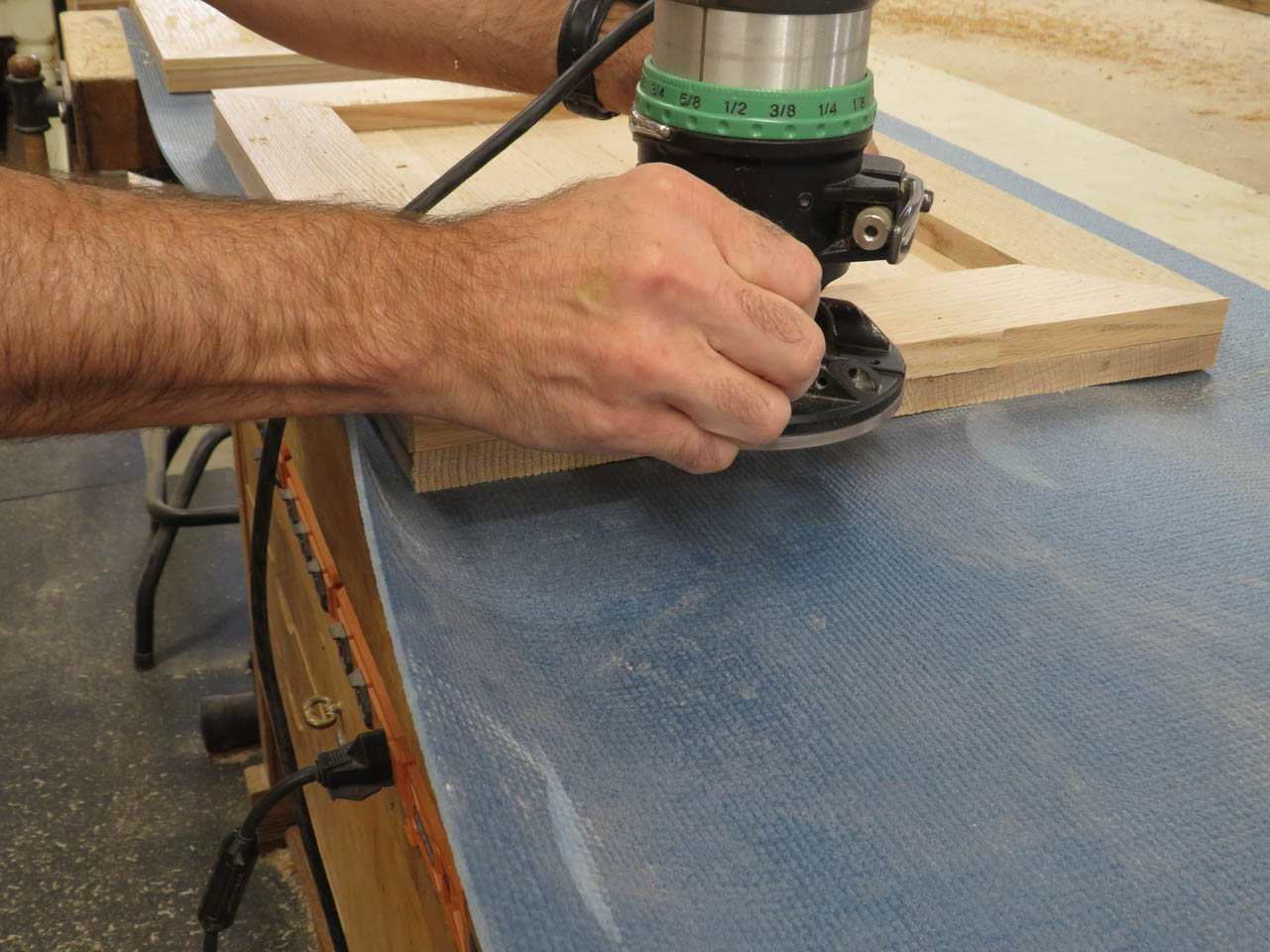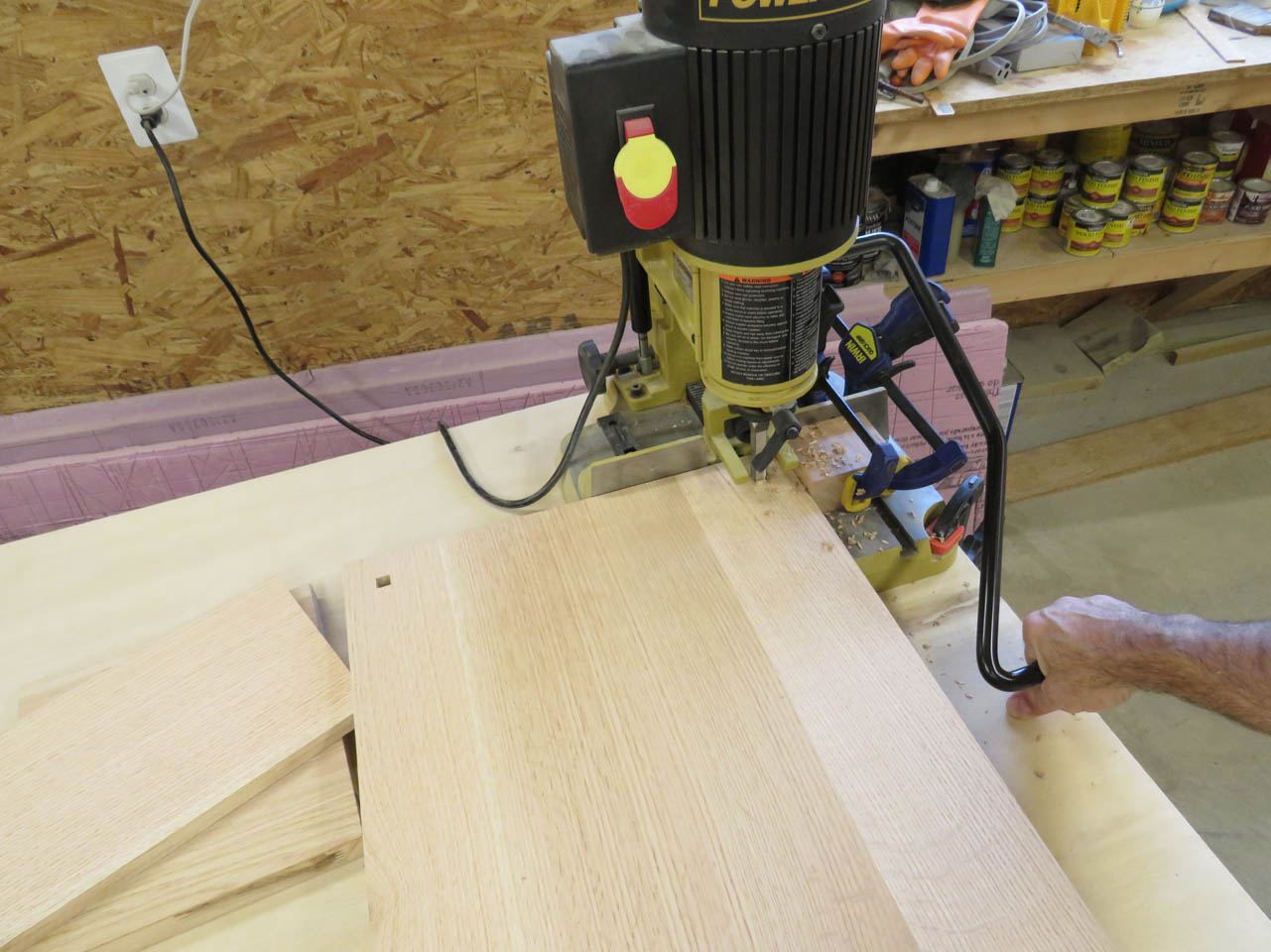 I set the fence and a stop block so that I could center the cutter 1-3/8″ in from each side at the corner of each shelf.