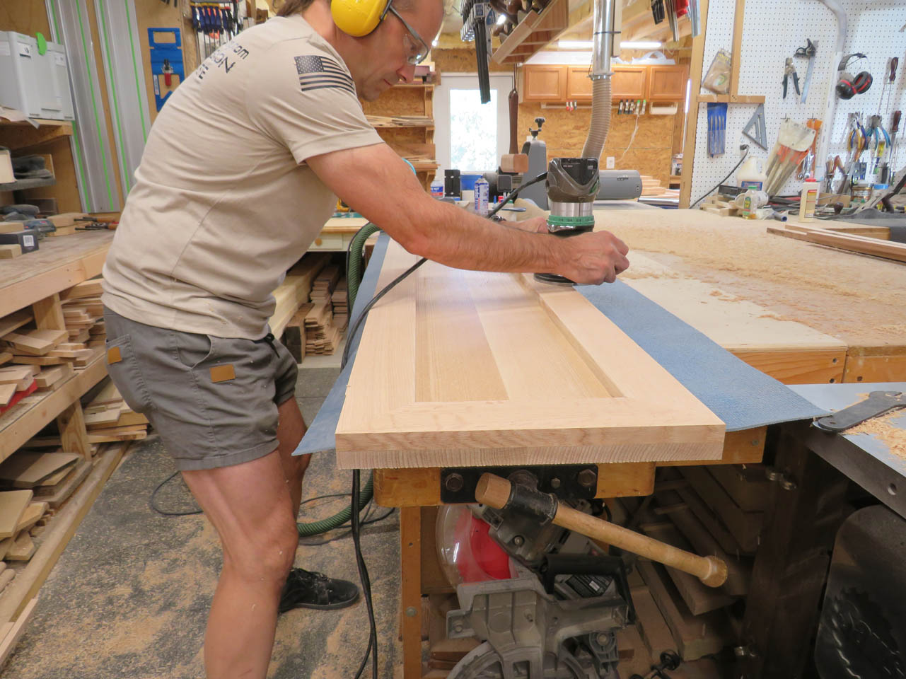 Unfortunately the big flush trim bit is too long for the thinner shelves and I won’t get the anti-tearout benefit because I will only hit one side of the bit. I have several other flush trim bits to use, so I switch to the spiral, compression bit on the right. This one also has blades running in two different directions and also has the benefit of cutting in shear because of the spiral. It only has a bearing on the top, so I have to flip the boards over and cut with the bit hanging below the bottom of the board, so I have to be careful to hang the board over the edge of the bench while cutting.