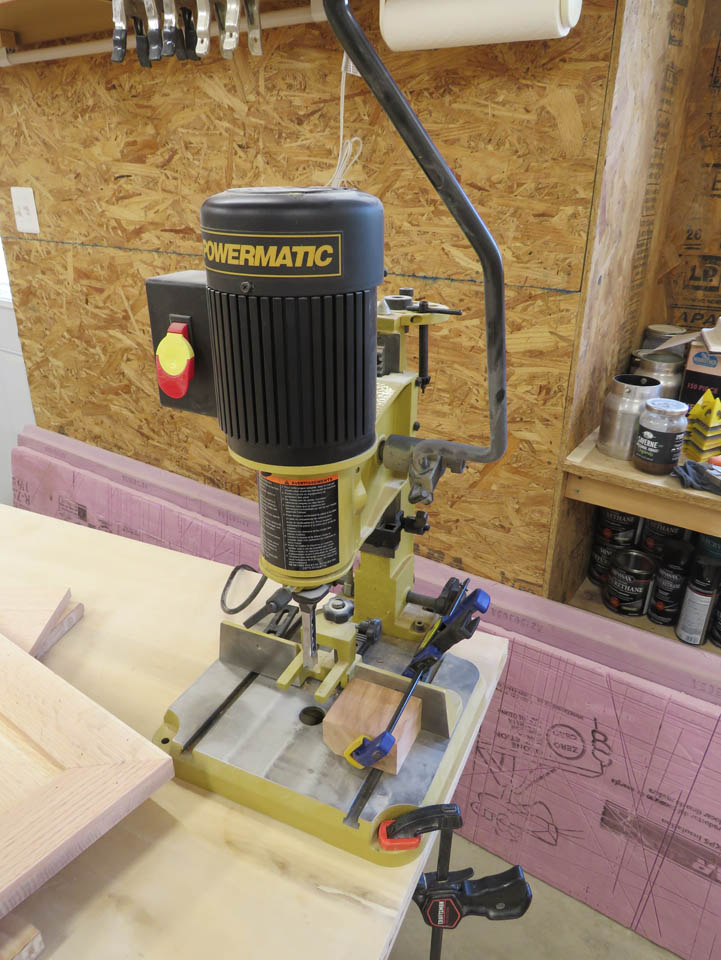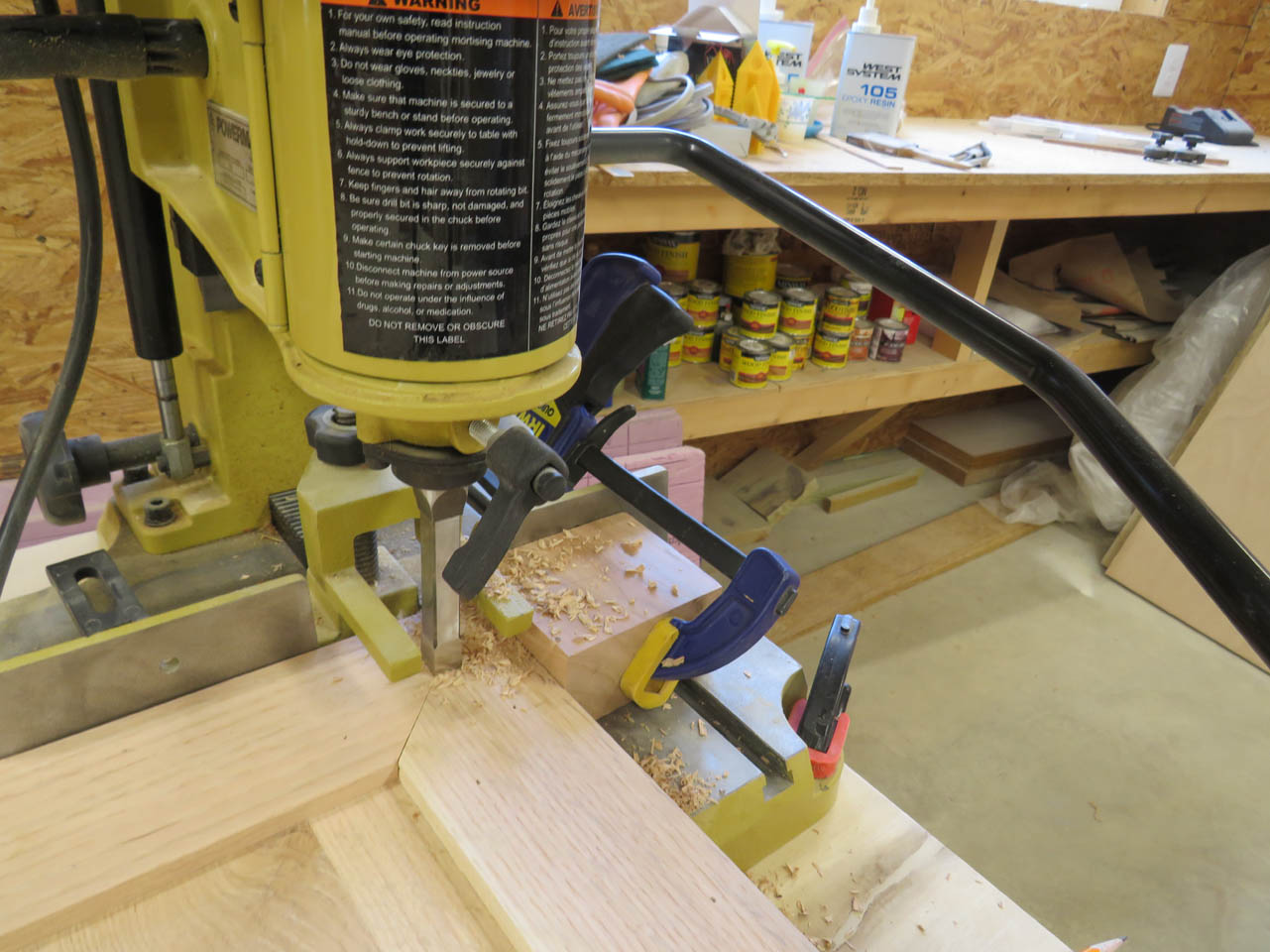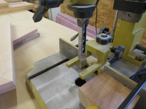 Well, moving on… To create the square mortise in each shelf, to locate and orient each leg and column. I am using my hollow chisel mortiser. It functions like a drill press, but uses an auger-style drill bit wrapped with a square chisel. There is a long lever arm to drive the square chisel into the wood while the auger clears most of the wood away.