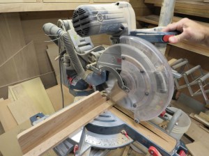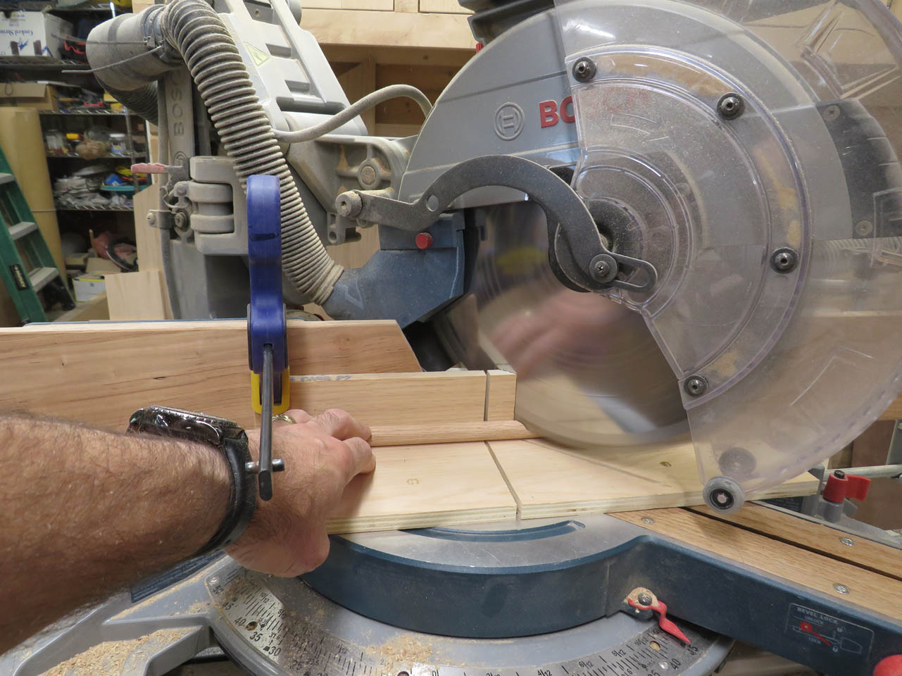 Next, I carefully mark and cut each piece on the miter saw. I set up a sacrificial fence on the saw to reduce tear-out and have an accurate slot to line my mark up with for cutting.