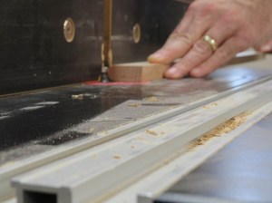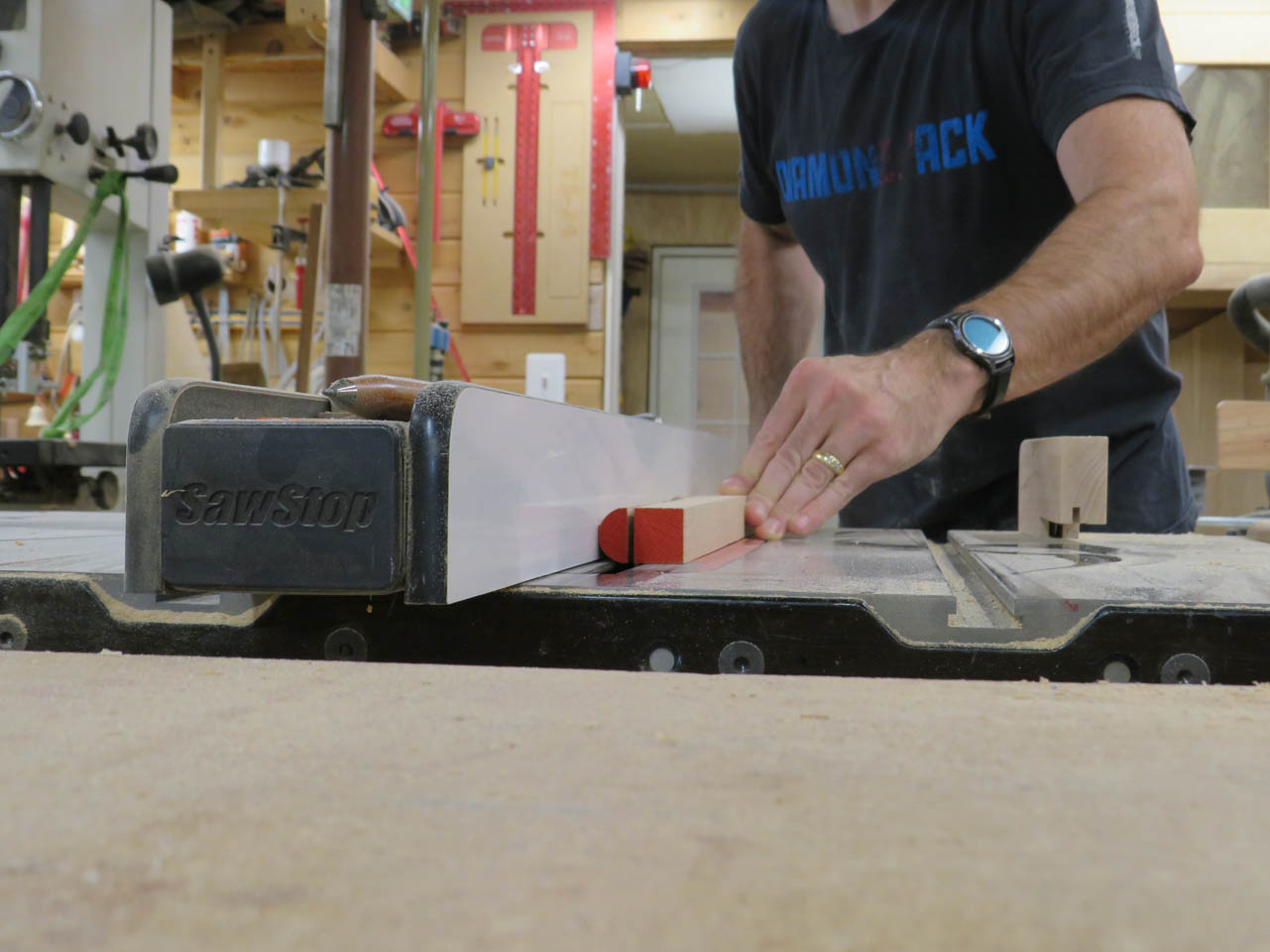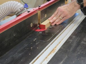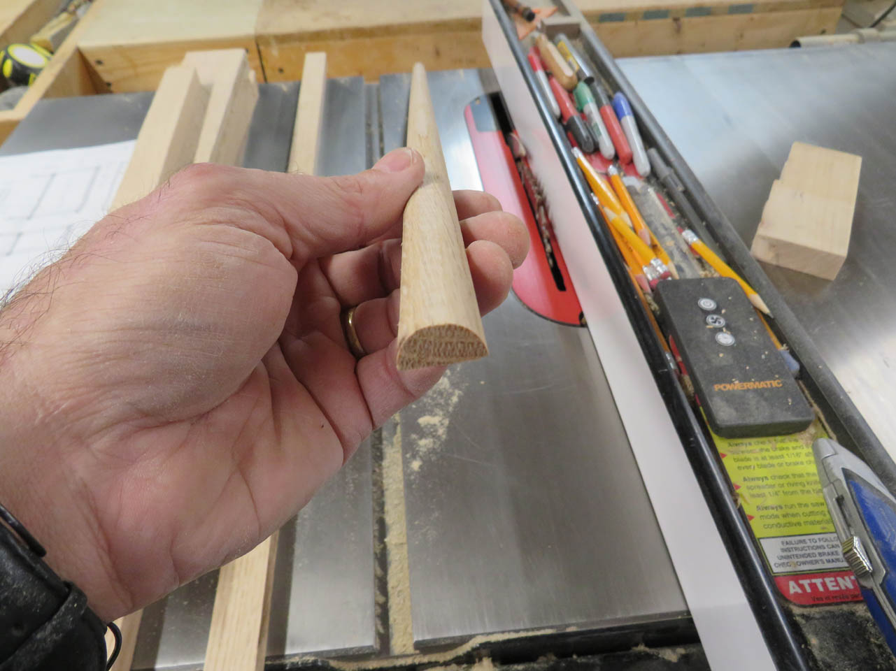 I can now set the table saw fence to 5/16″ and pass the rounded side through, cutting off just the bullnose. Then I can repeat the process until I don’t have enough stock to hold onto and safely cut.