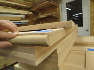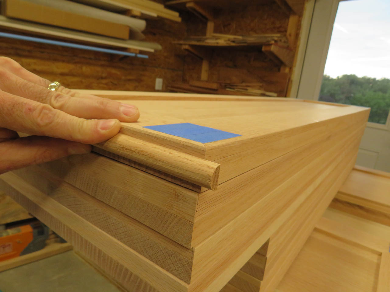 To cut the bullnose trim for the shelf and top, I have a couple of options. I can cut the full bullnose in one pass with the bullnose bit or in two passes with a round-over bit. The bullnose bit is faster but can have problems with tear-out and can also cut off-center if the stock has a slight bend to it. I have to create a 5/8″ bullnose for the center shelves and a 1″ bullnose for the table top. I think I will use the round-over bits and make two passes. Oak tends to tear-out easily so this will reduce the chances of that.