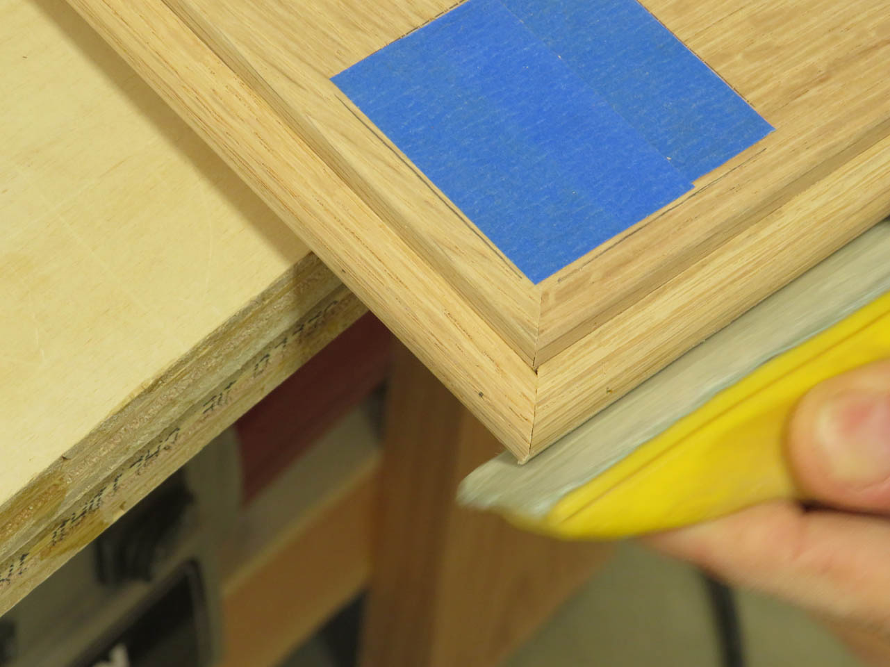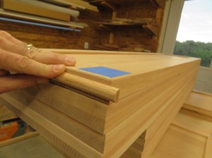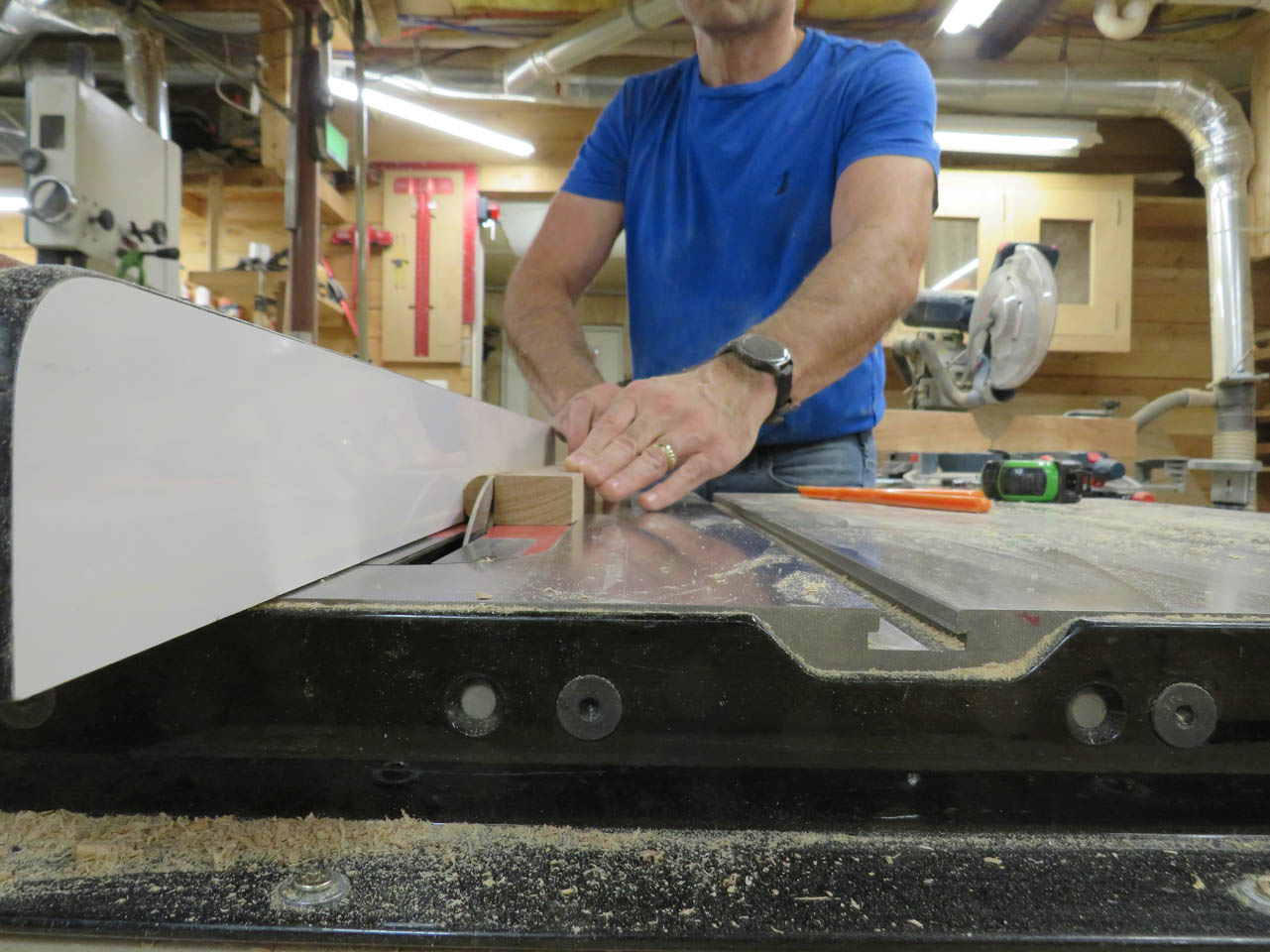 Since I don’t have enough room to finish all of the tops and shelves at the same time, I am going to do the shelves first. I cut a 1/4″ thick strip to set the height of the trim for attachment.