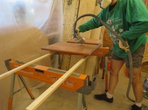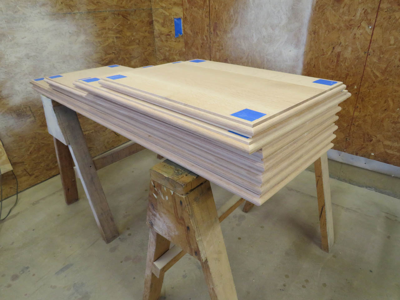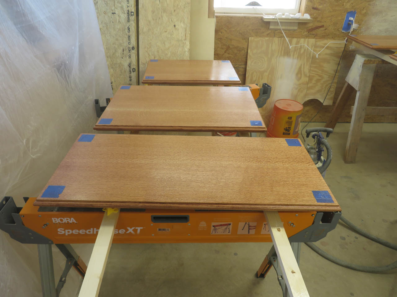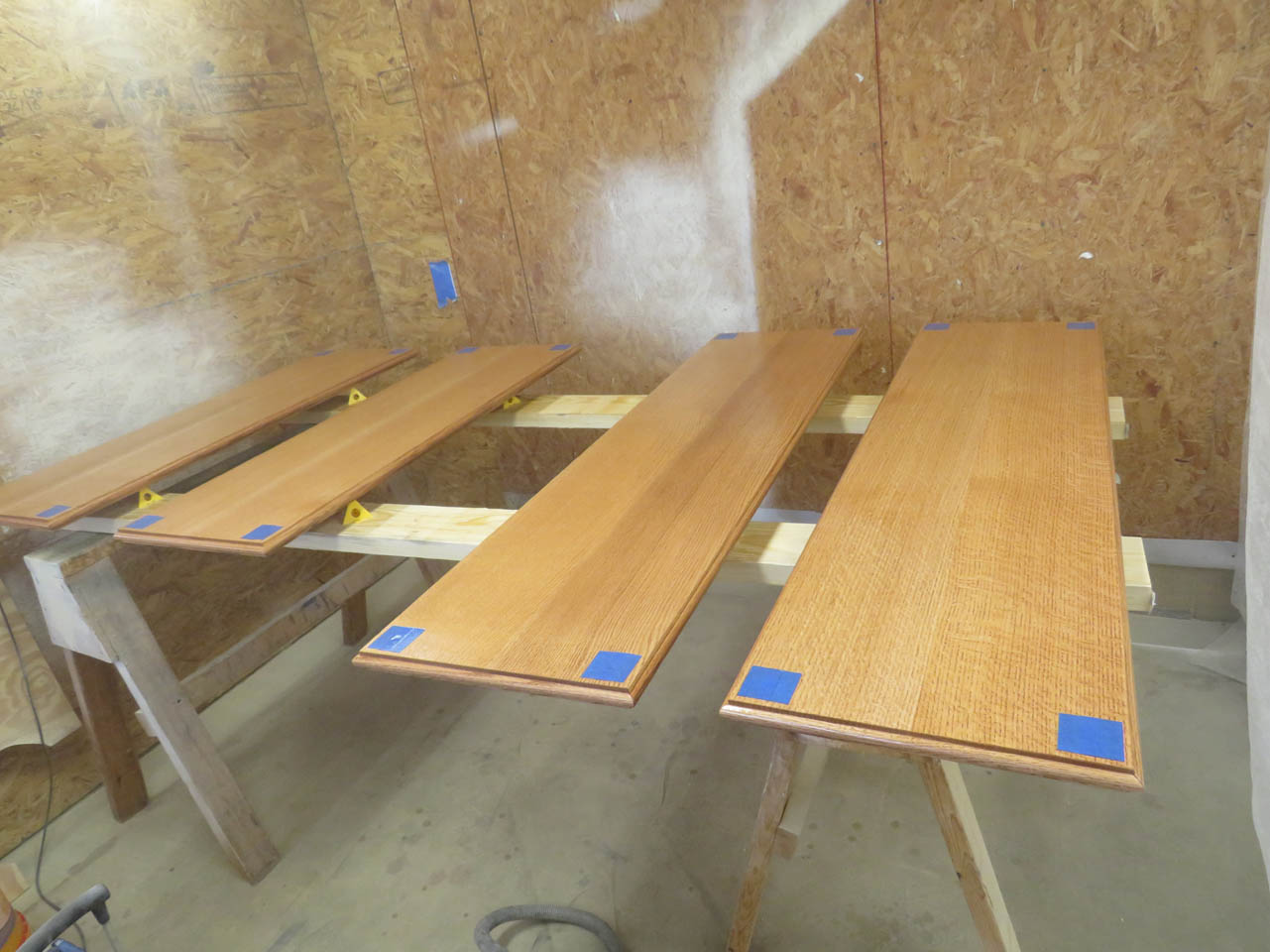 After the stain is applied, I can leave these to dry overnight, in my spray booth and start making on the 1″ trim for the table tops.