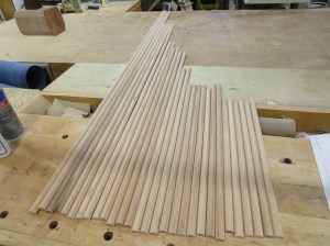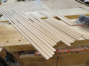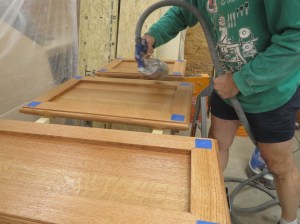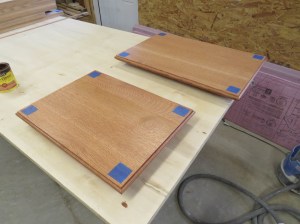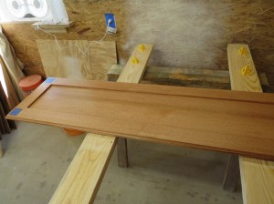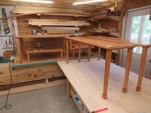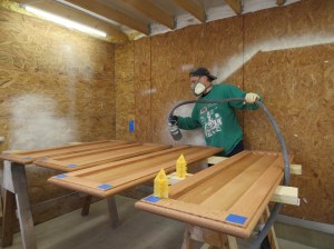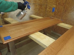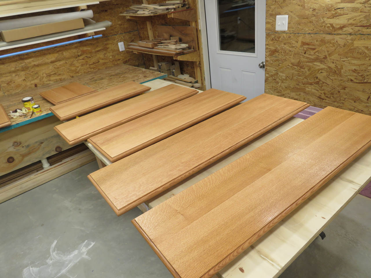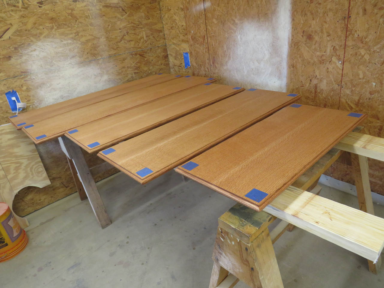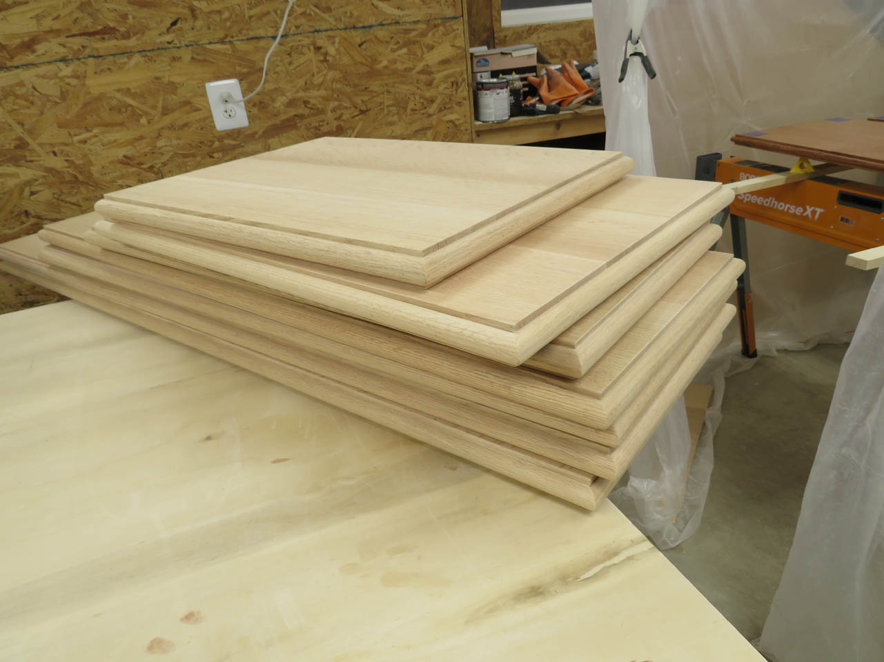 After the stain is applied, I can leave these to dry overnight, in my spray booth and start making on the 1″ trim for the table tops.