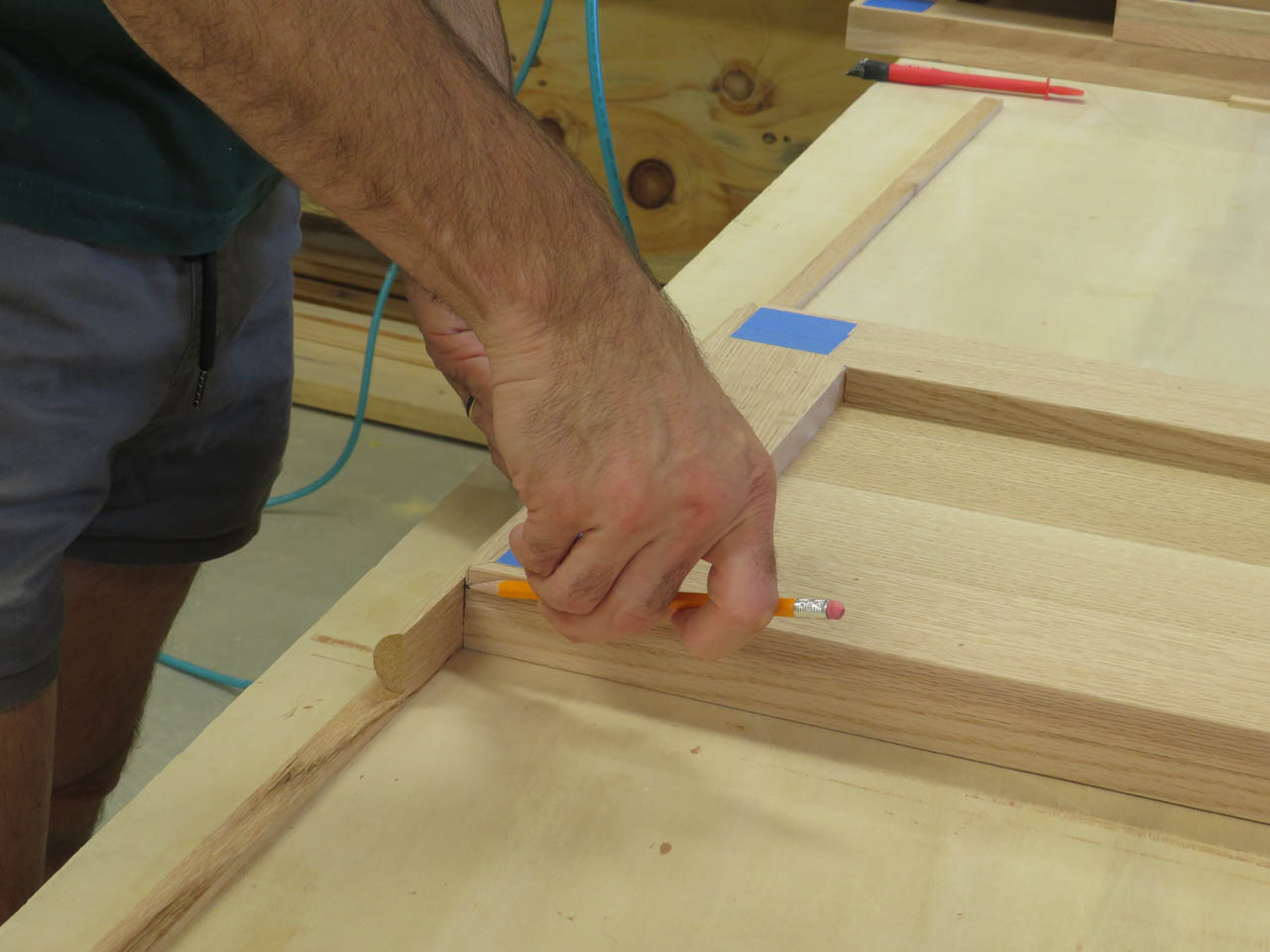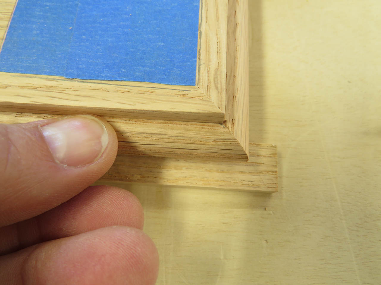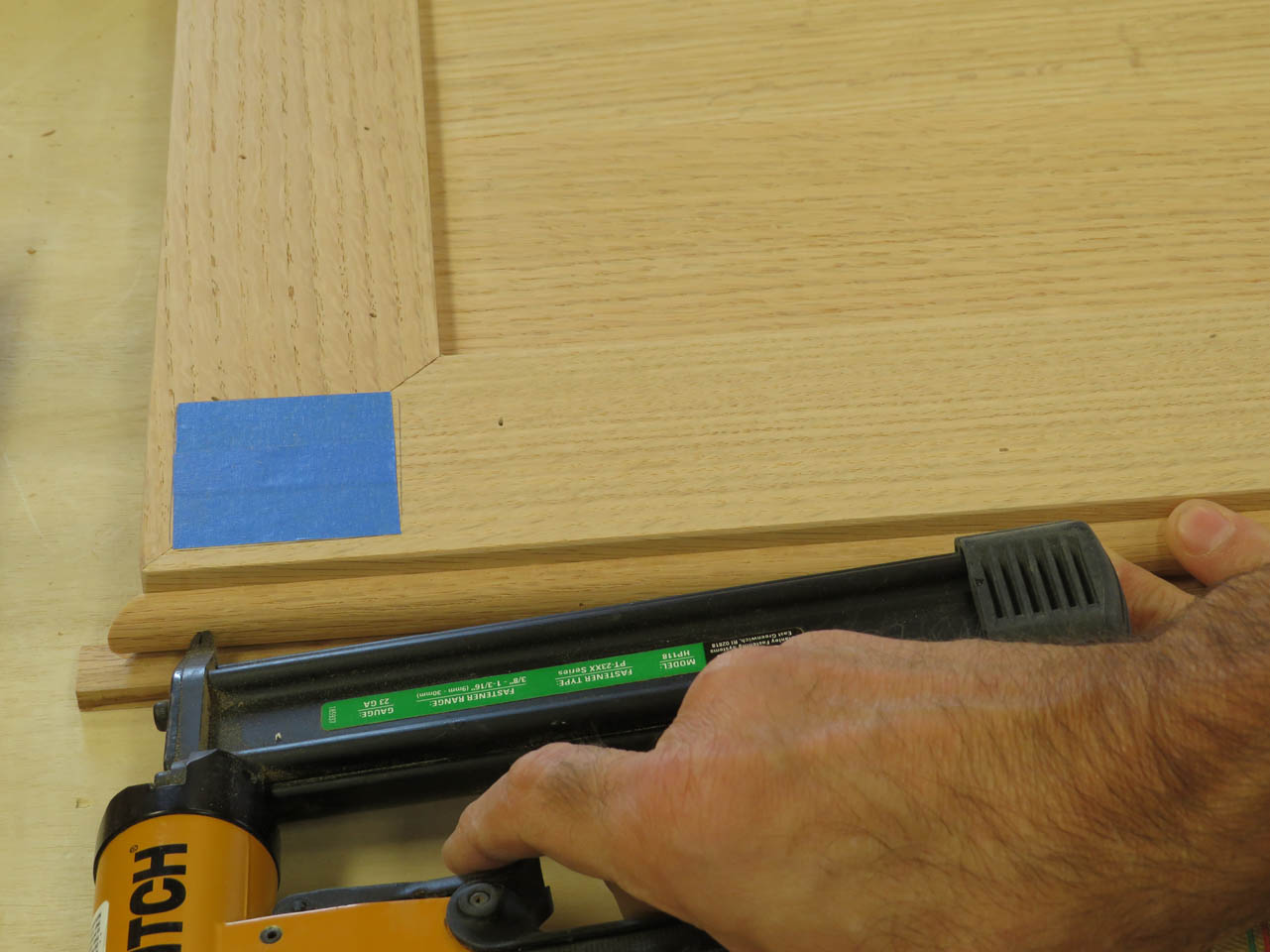 I carefully tack the trim in place all the way around, holding the bevels tightly together.