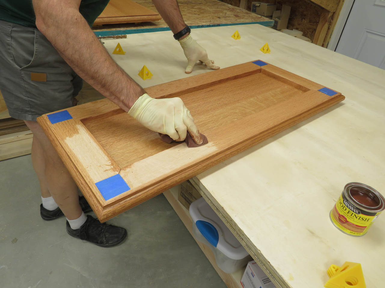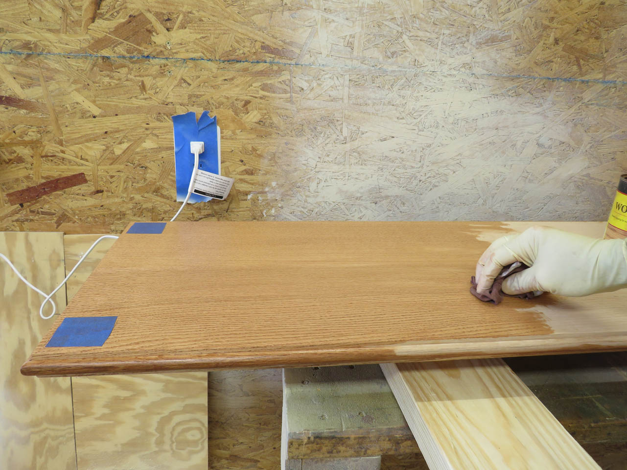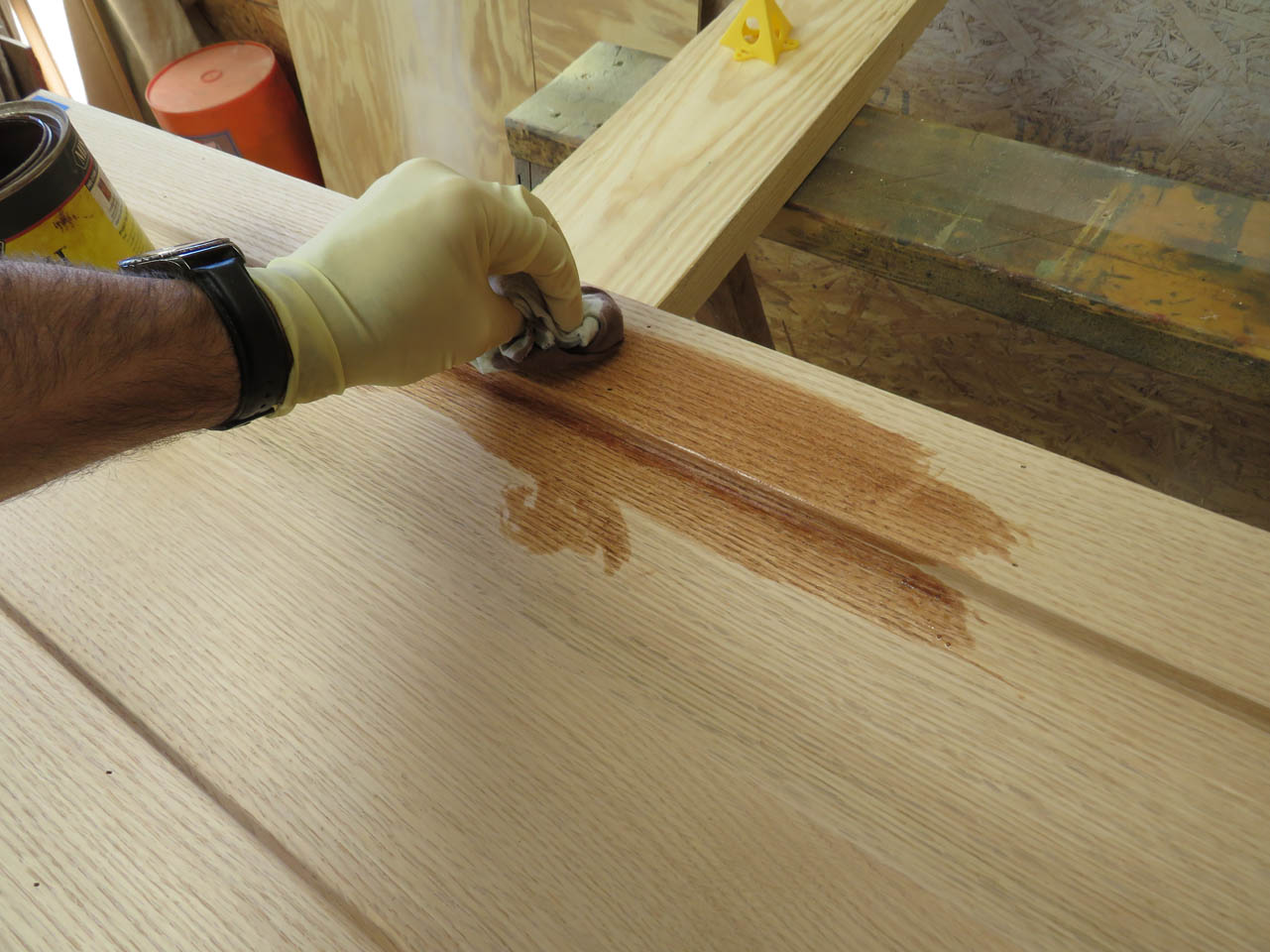 I am using Minwax Cherry 235, rubbed on evenly with a lint-free cloth.