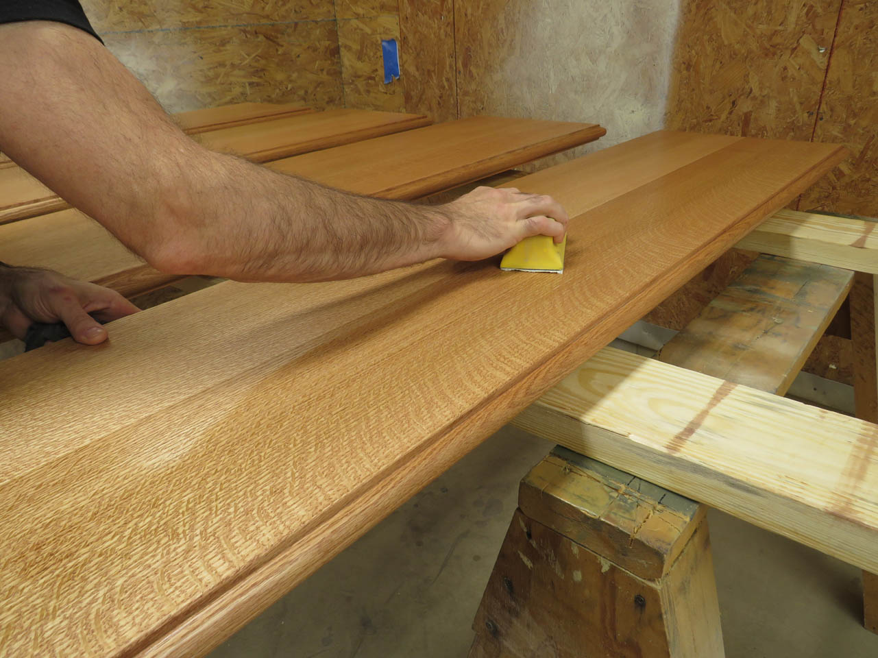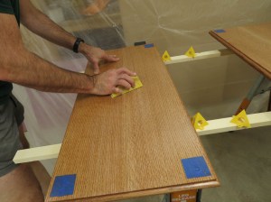 The first coat of polyurethane is dry, I can now sand all of the finished surfaces with 400 grit sand paper and wipe them down to prep for the second coat.