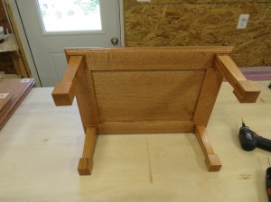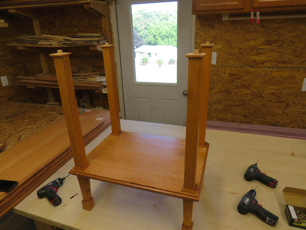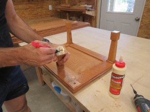 While those are drying, I can start attaching legs to the bottom of the now, finished shelves.