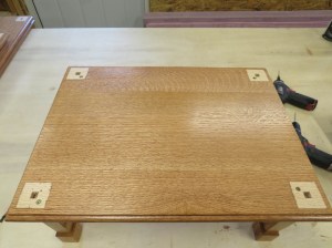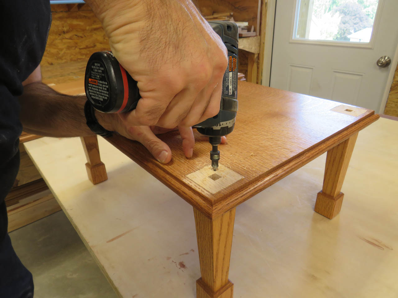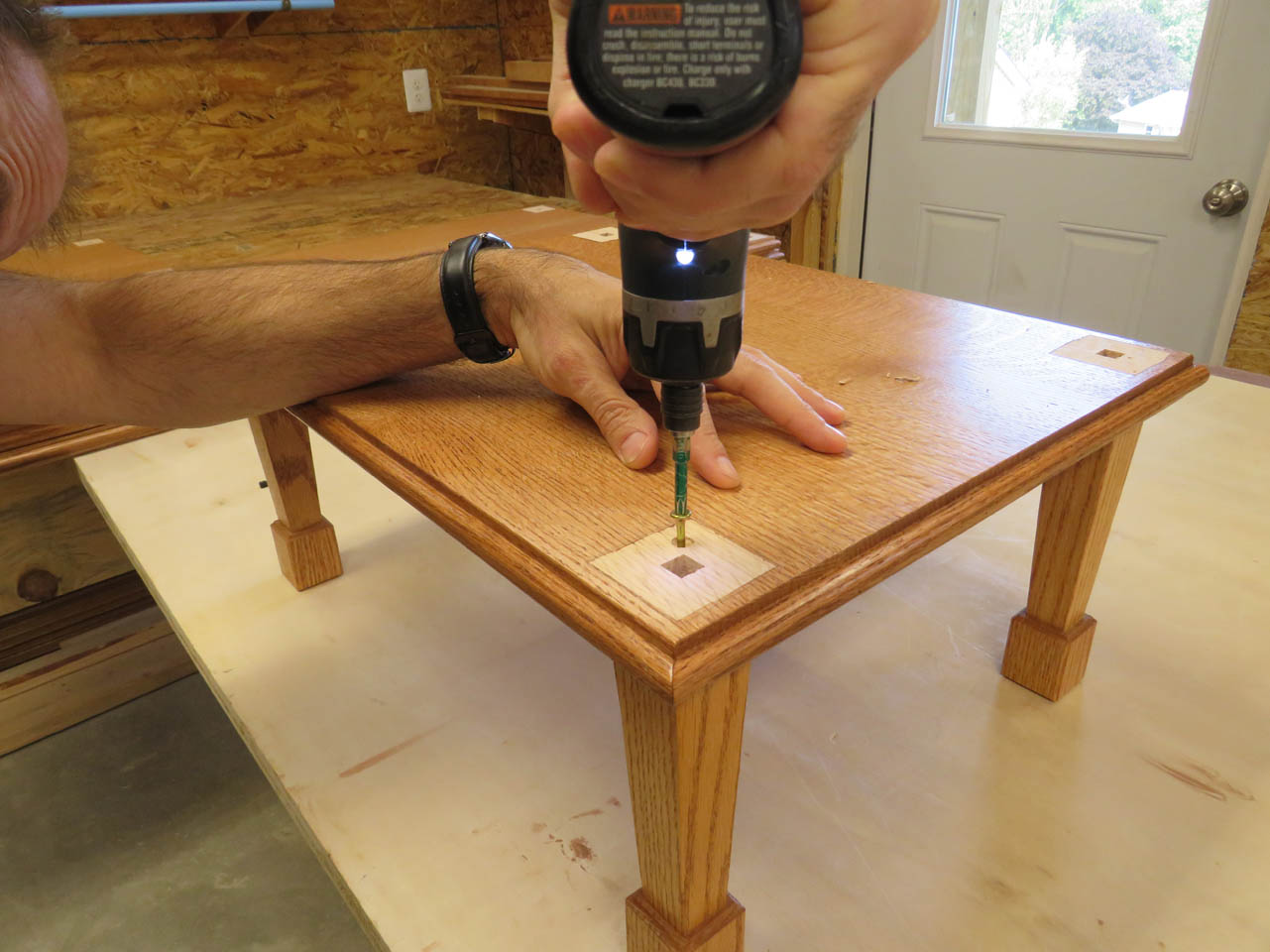 Glue should be sufficient to hold the legs on, but they are awkward to clamp in place perfectly straight. to hold them tightly on while drying, I drilled and countersunk some pilot holes. I angled the holes to point towards the center of the legs, then drove in a 2-1/2″ long construction screw to draw the leg up tight.