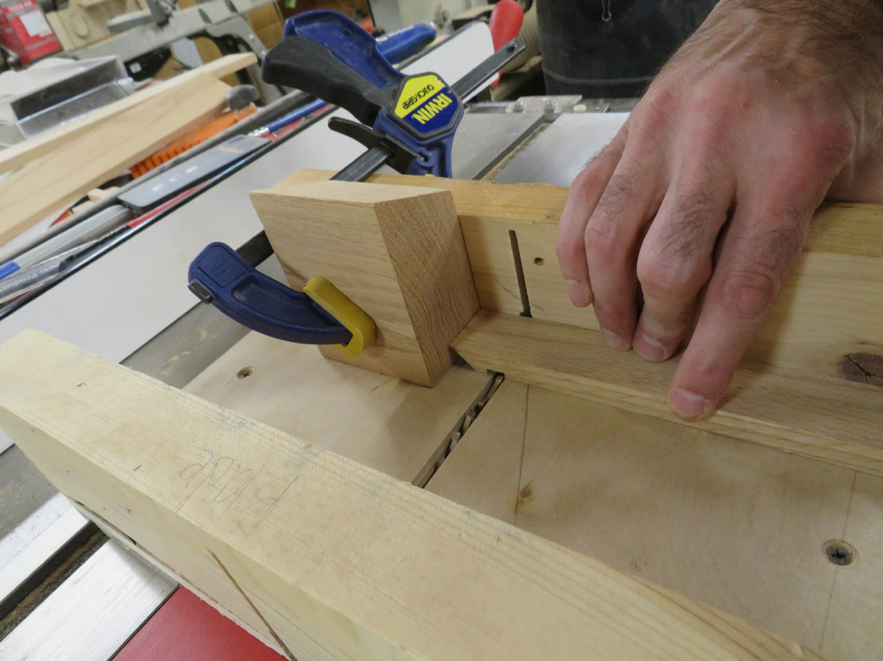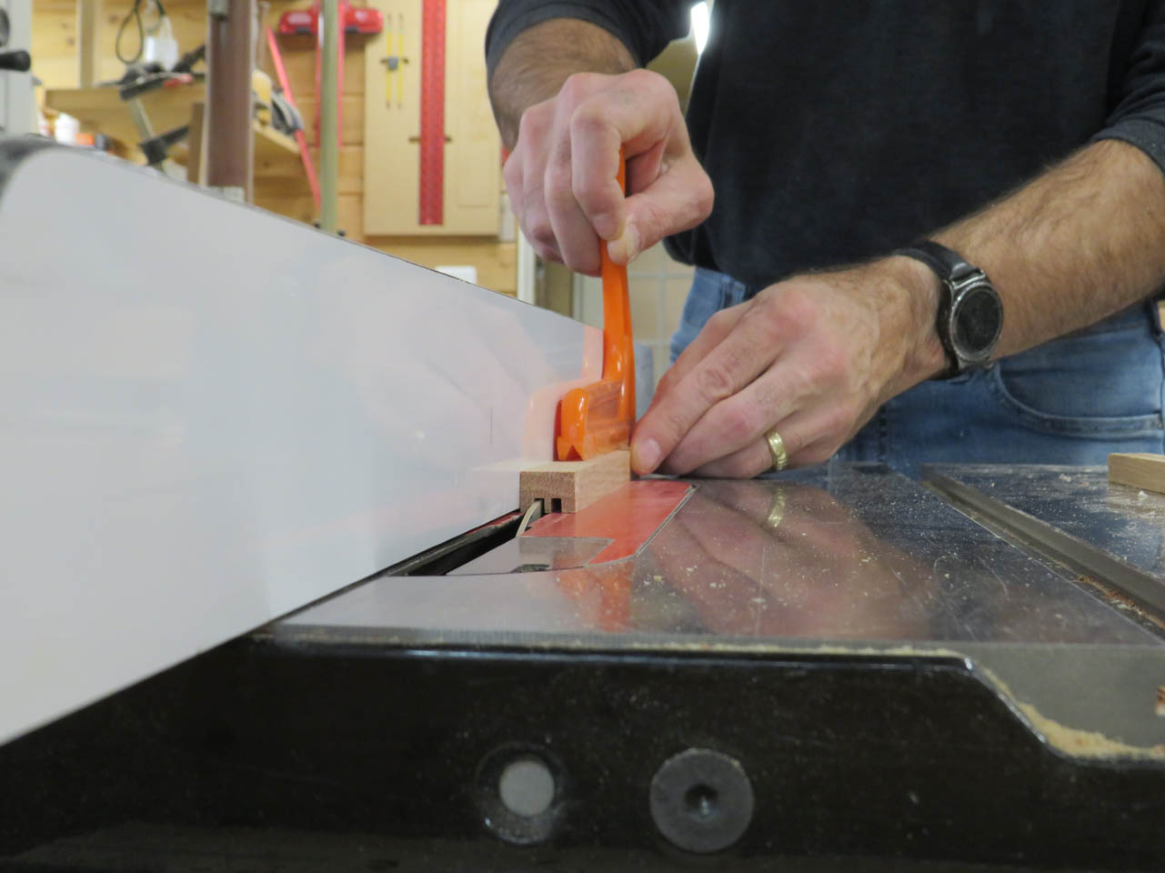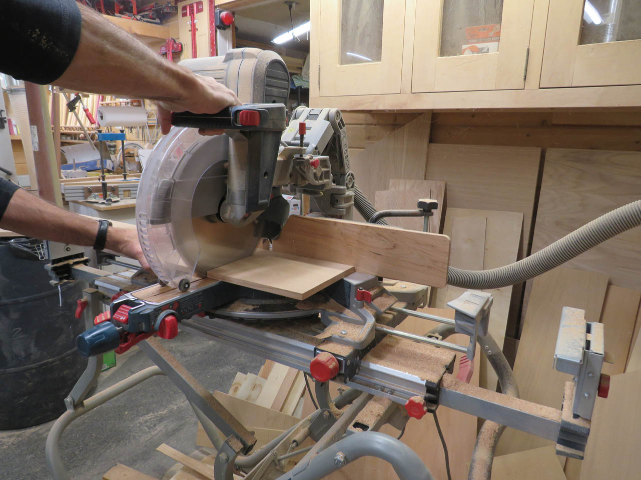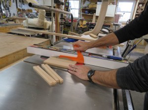 To cut the smaller end caps to length, I used my small cross-cut sled. I can clamp a block to one side and safely cut eight equal length pieces.