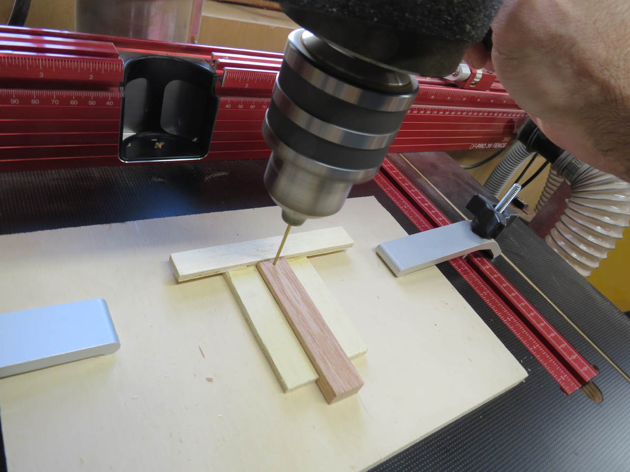 I transfer this pilot hole to the rest of the frame by clamping it all together and then using the hole to drill deeper into the sides.