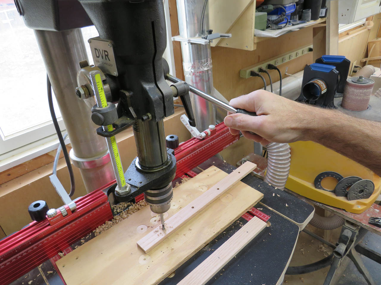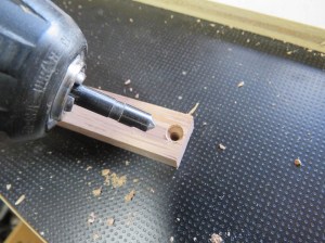 I used a forstner bit to drill a clean through-hole, that used a slightly larger twist drill to open the hole up 1/64″ bigger so the 1/4″ dowel would spin freely. (They don’t make forstner bits in 1/64″ sizes…)