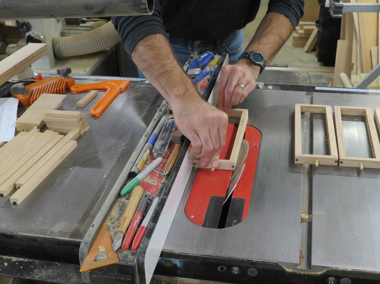 I made three passes on the table saw to remove the center channel of the frame sides.