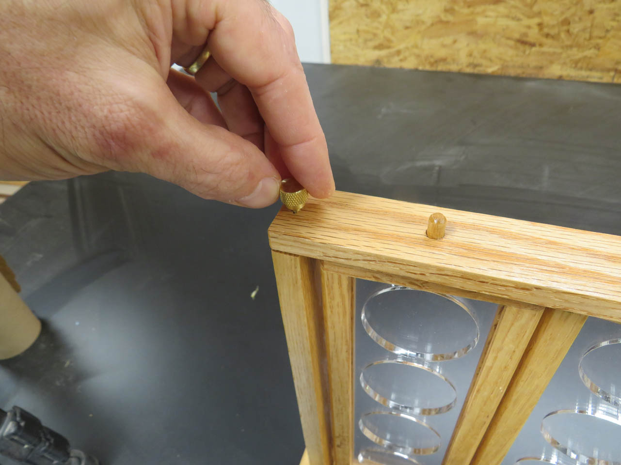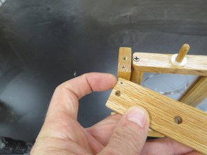 I forgot to take a picture but I also attached a nylon washer to the top and bottom dowels with some CA glue before starting to apply finish.
