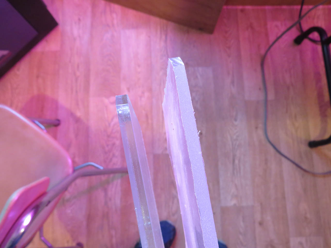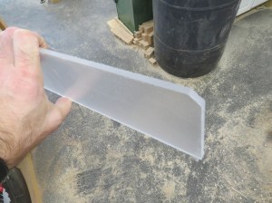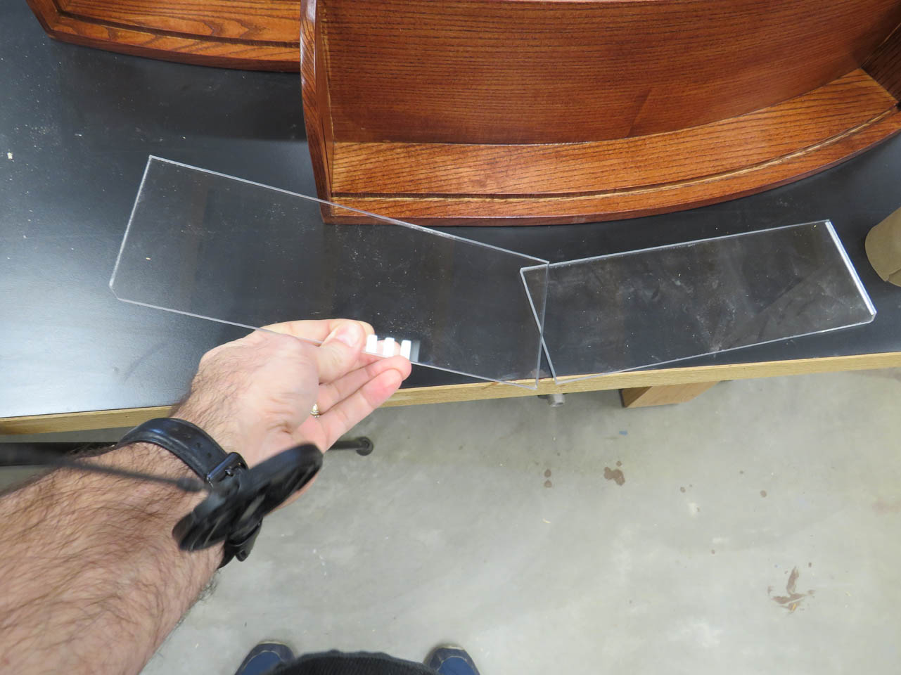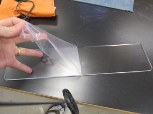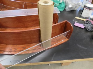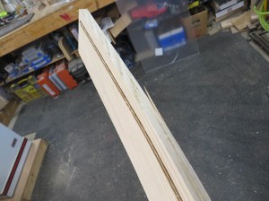 Since that has to sit at least half a day before the next coat, time to start on the acrylic. I bought a sheet of .22″ thick clear acrylic. I cut several pieces 4″ wide by 24″ long. All of these are oversized.
