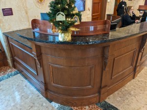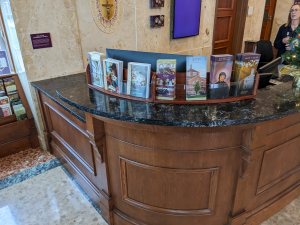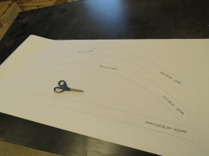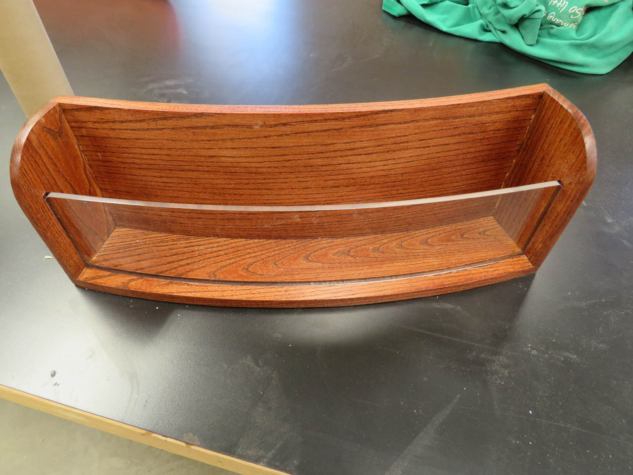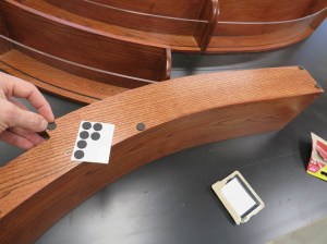 I have an interesting new project for the Seton Shrine. They want a curved pamphlet rack for the welcome desk at the Mother Seton museum entrance. The sent me the Welcome desk specs and I made a template from it. The spec indicated that the desk was symmetrical but when I overlaid the template with the desk, they were different by several inches. So I laid out each side’s pamphlet racks differently on either side of my template. Here is the design I came up with: Pamphlet racks.