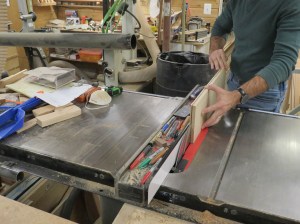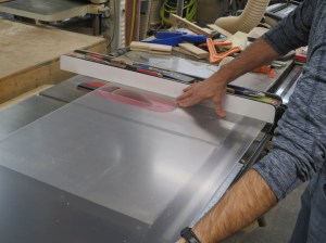 Then holding it against the fence of the table saw, I can roll the curve through the blade to cut the opposite side to the correct width.
