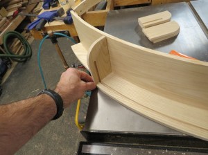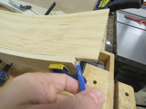 Next I clamped the form to the base, holding it exactly 3/8″ off the back where the new laminations will sit.