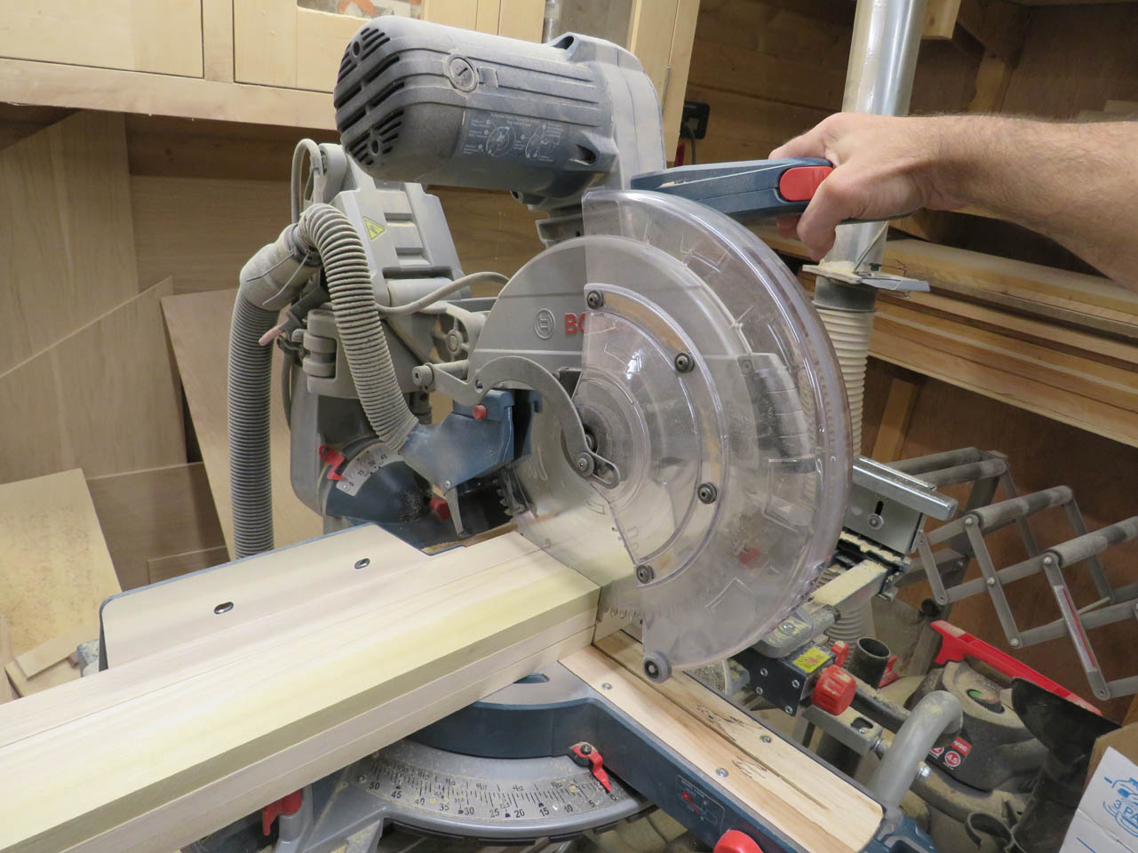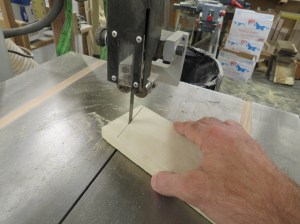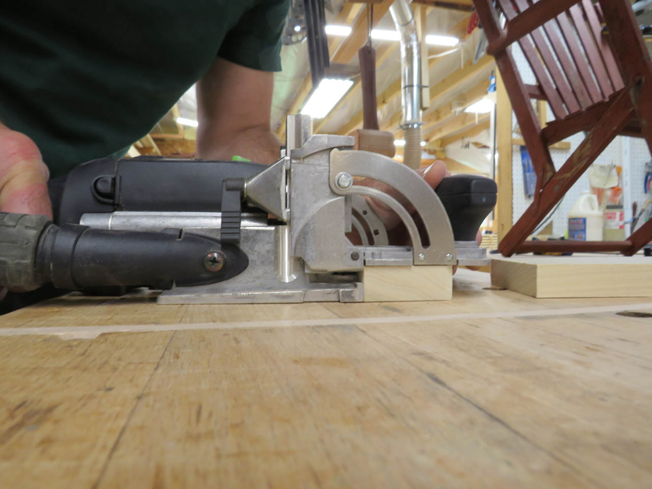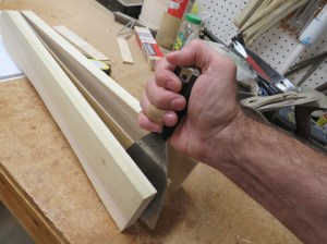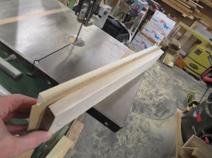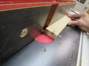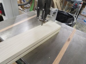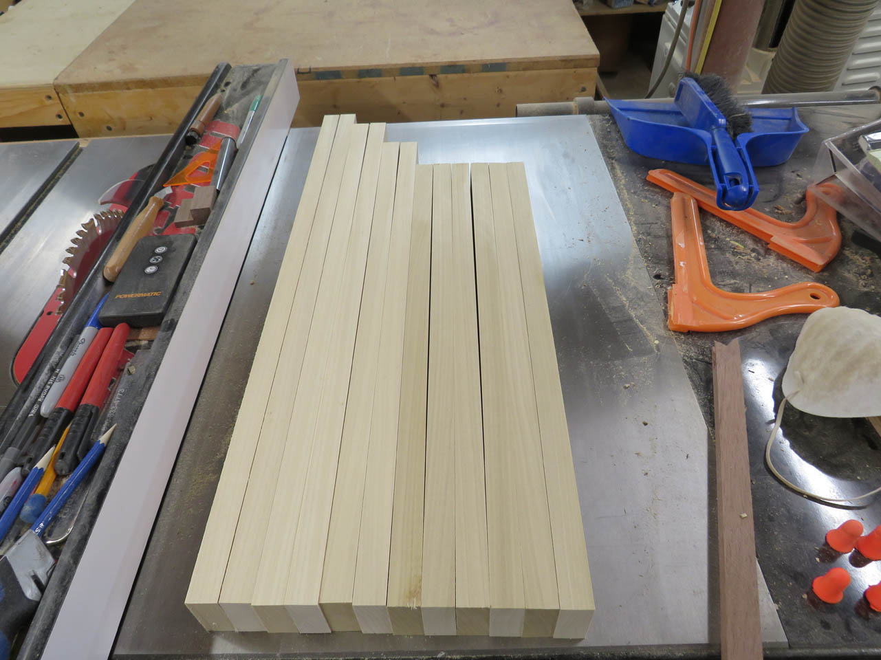 Mimicking the original, I created a bunch of 1-1/4″ wide slats for the seat. I ganged them together to be cut to the exact same length, all at the same time.