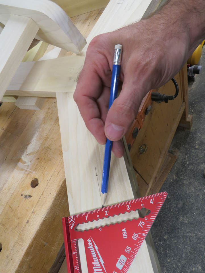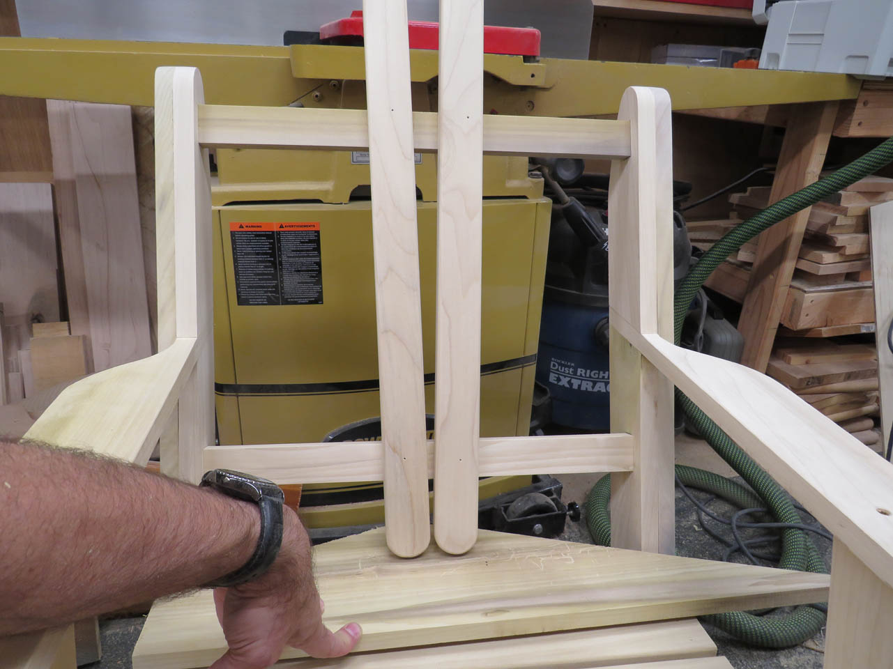 To start the back layout, I placed a 3/4″ thick block on the bottom to have somewhere to sit the first slat. I marked the center and splayed the center back-slats in a slight vee.