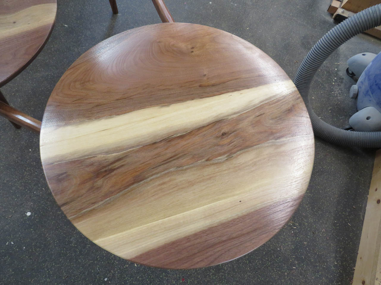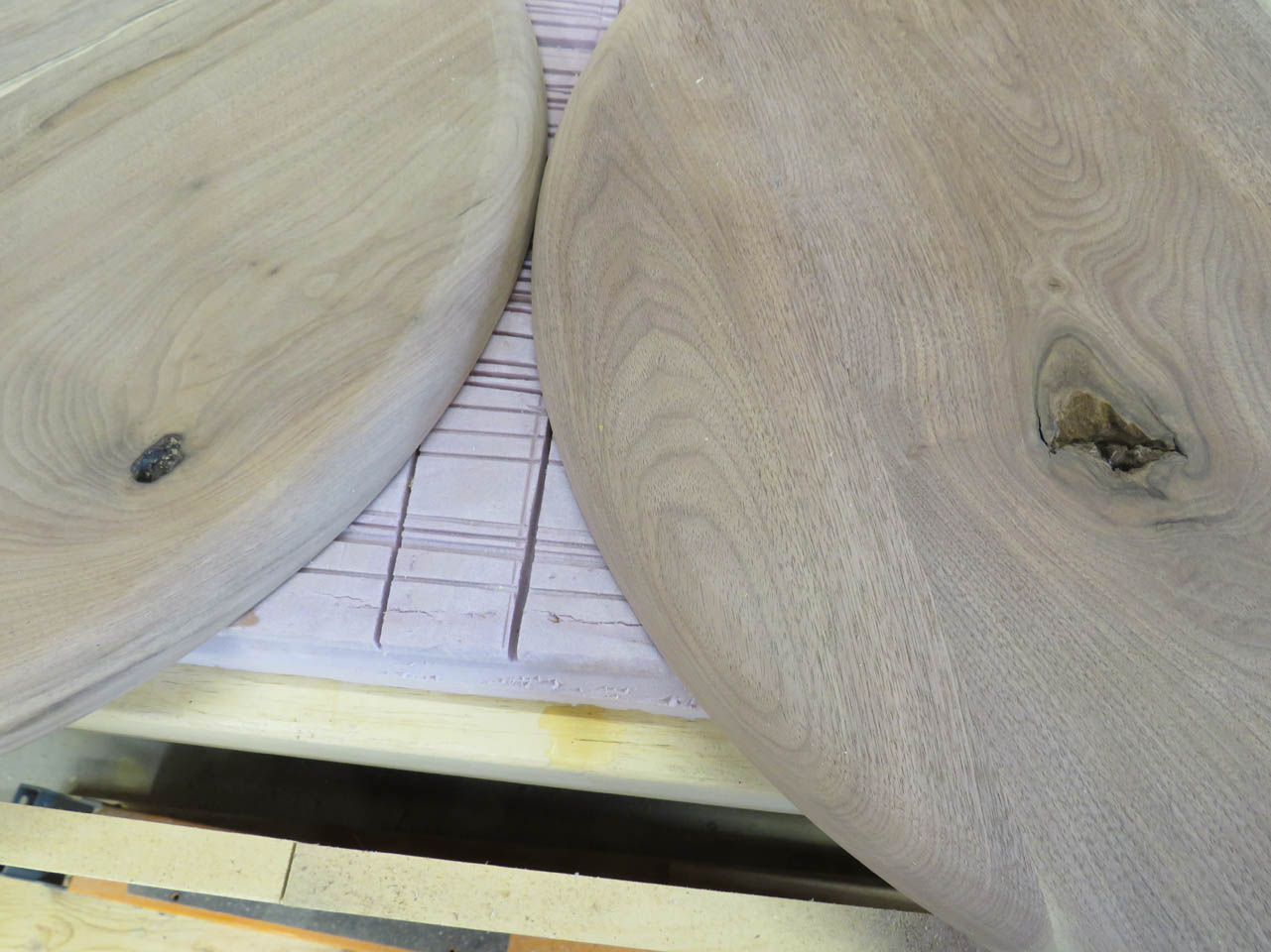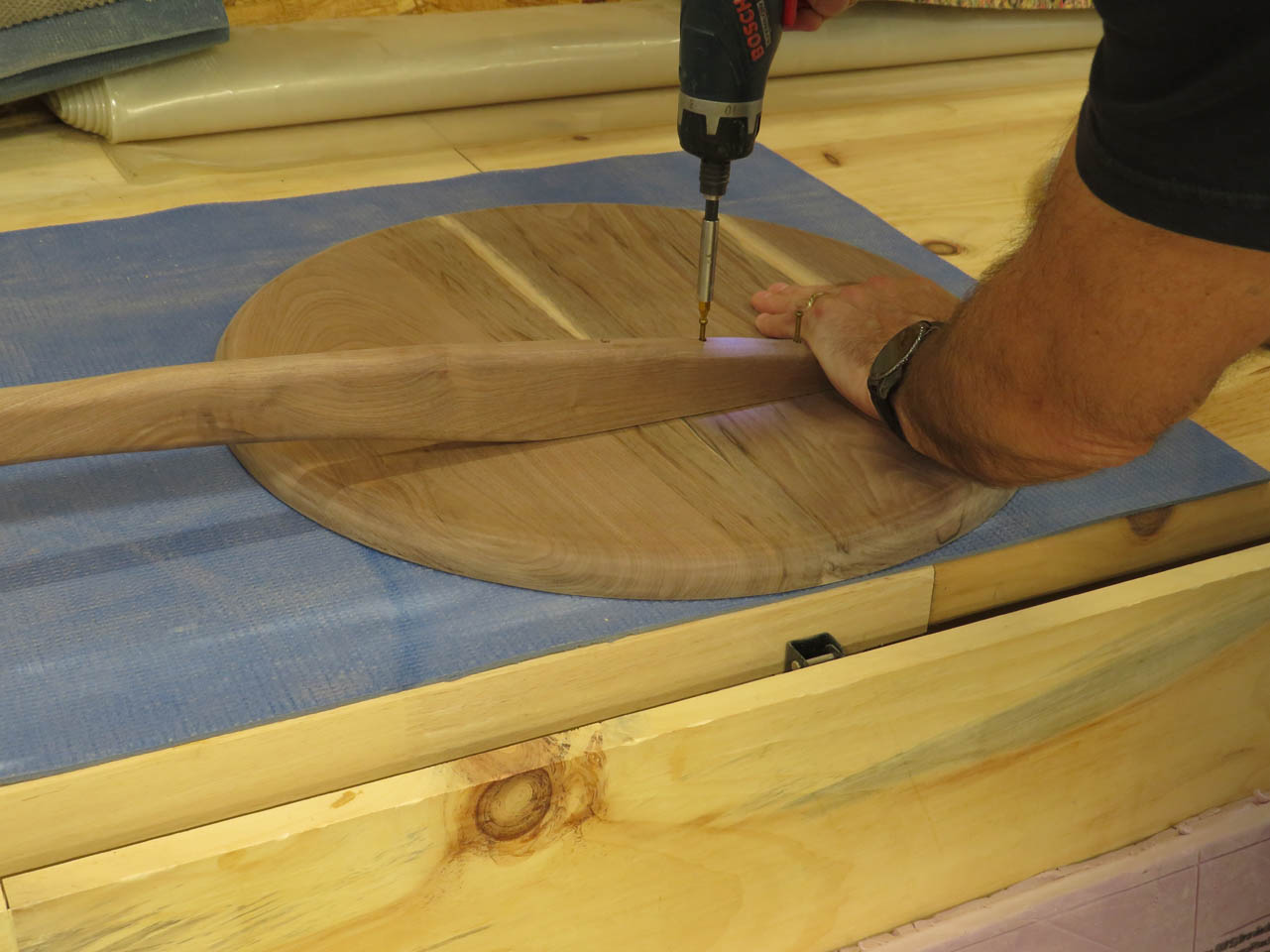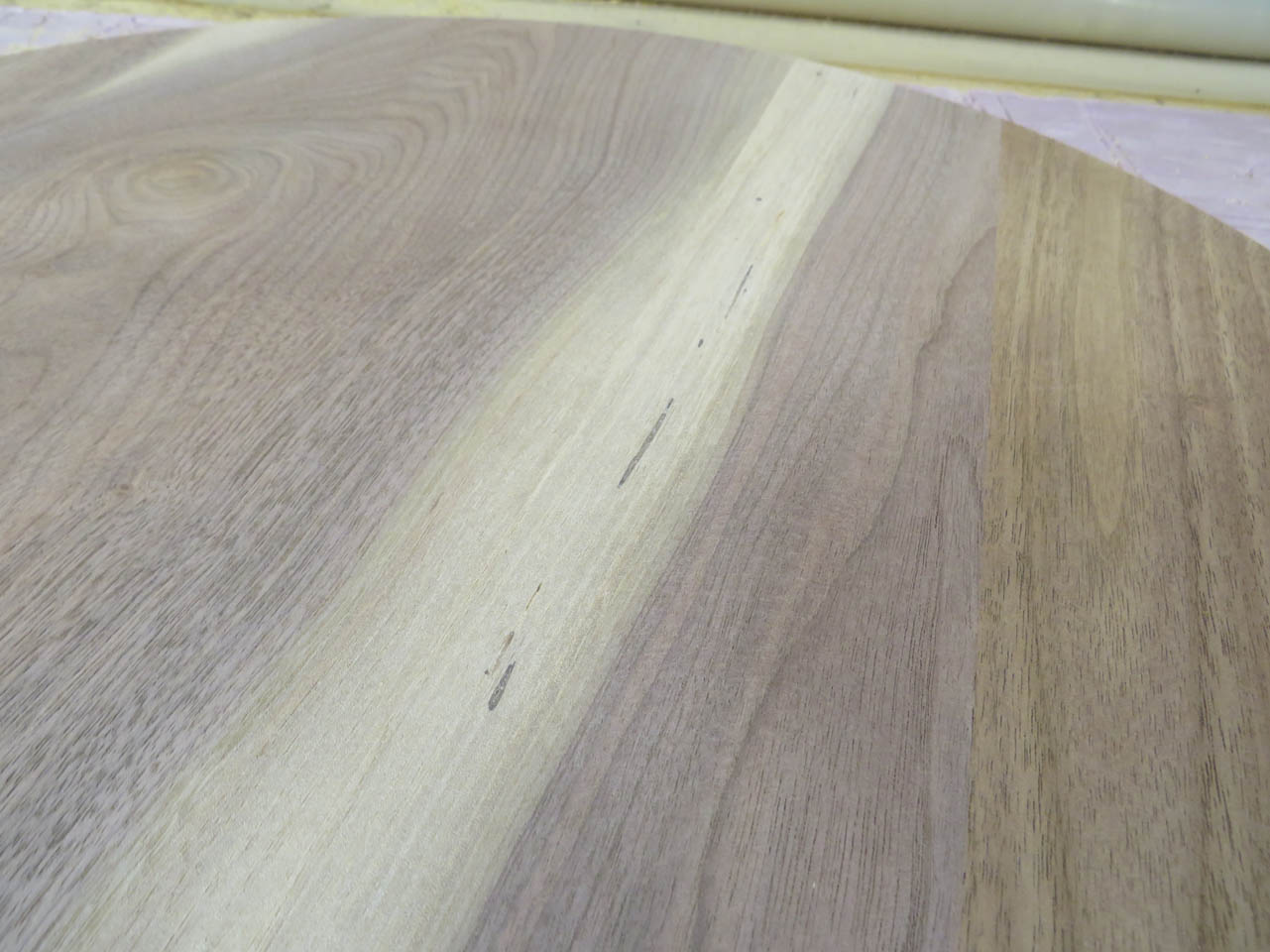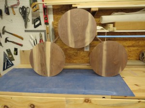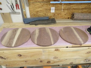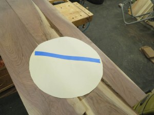 I moved the boards around to attempt to match the grain. I cut out a 20″ diameter circle to help me rough-cut the boards to a shorter length.