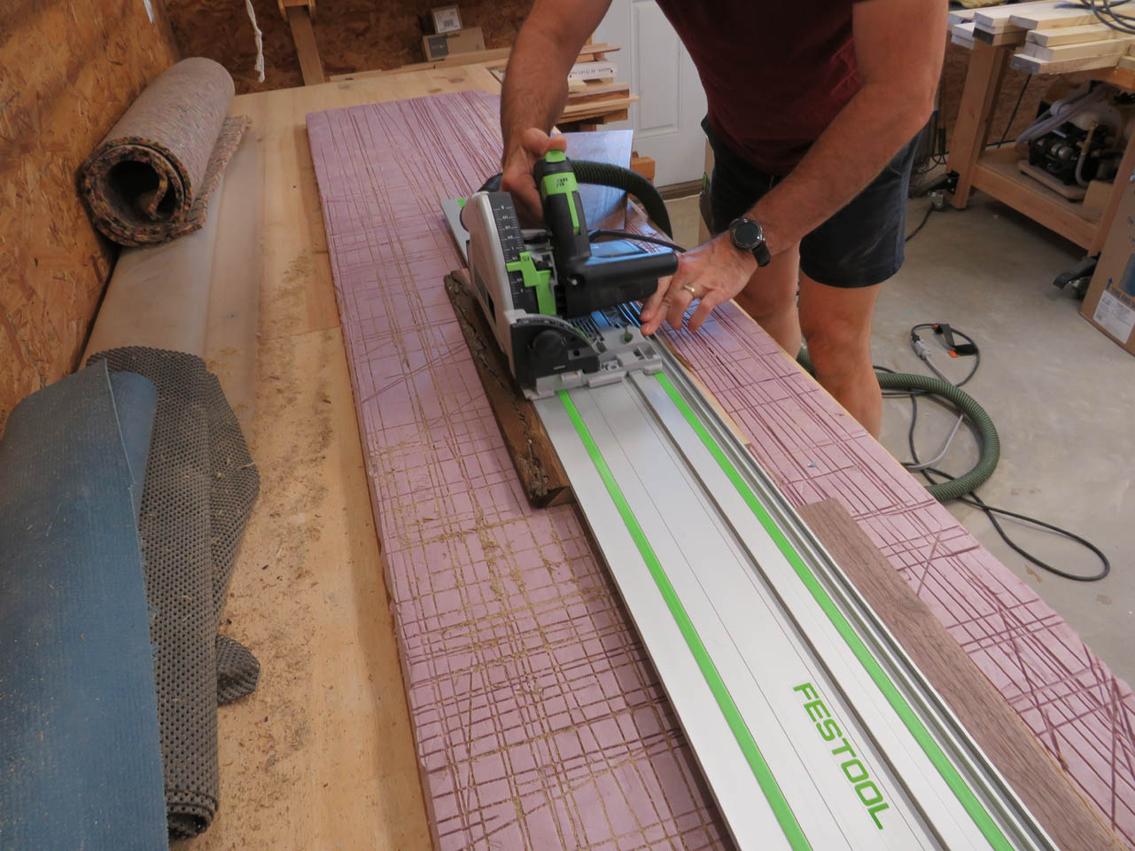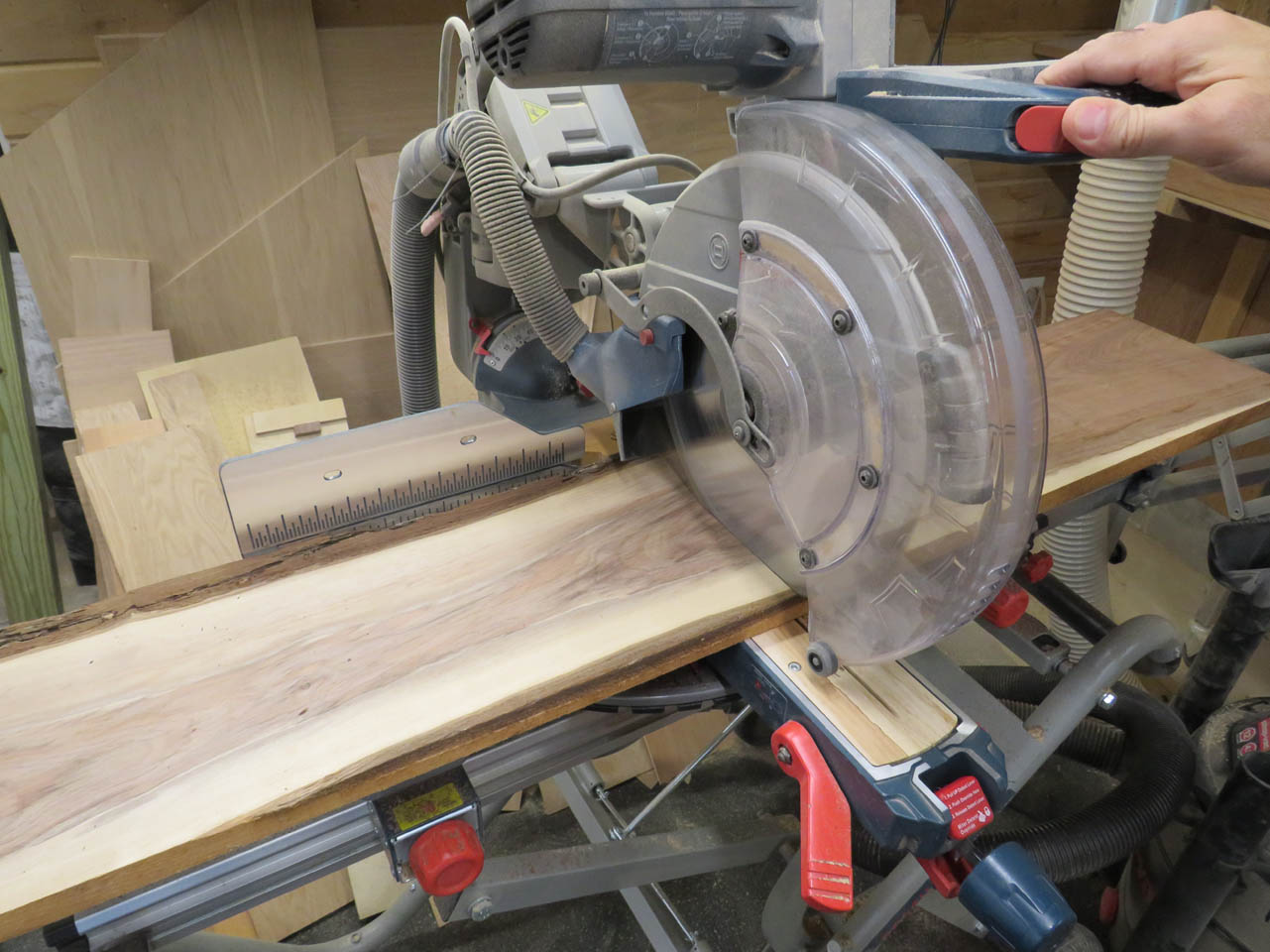 I used the miter saw to shorten the boards and my track saw to cut off the bark that edged the sapwood.