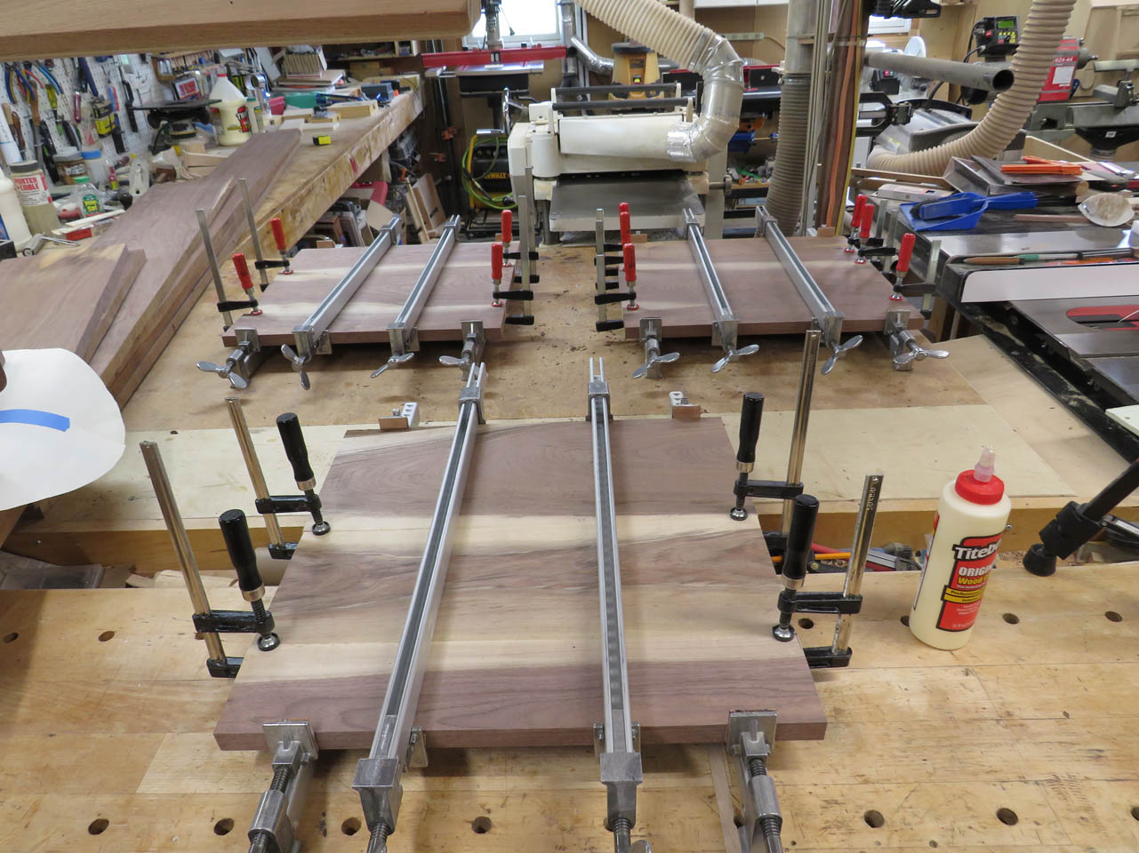 I use clamps on the ends to hold the faces flush at each joint to encourage the joints to be as flat as possible since they are now too wide to fit through my planer.