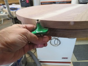The next step is to round over the bottom edge. I made the tops about 7/8″ thick so I grabbed a 3/4″ round-over bit to cut the radius. That will leave 1/8″ at the top for the bearing to ride along.
