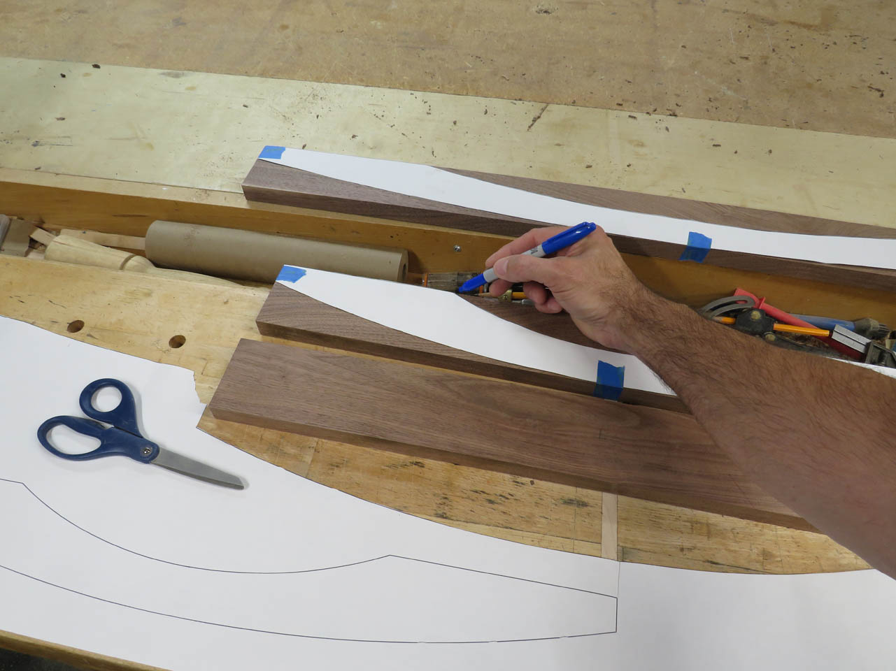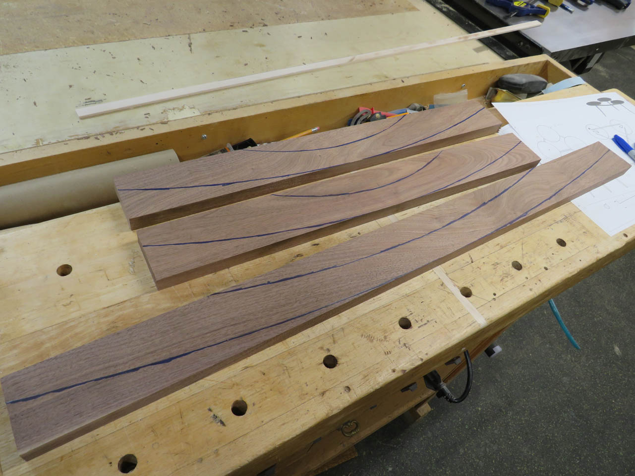 I was originally trying to lay these curves out with a thin piece of wood that could be bent to the proper radius, then I remembered that I had a large format printer so I just printed templates instead…
