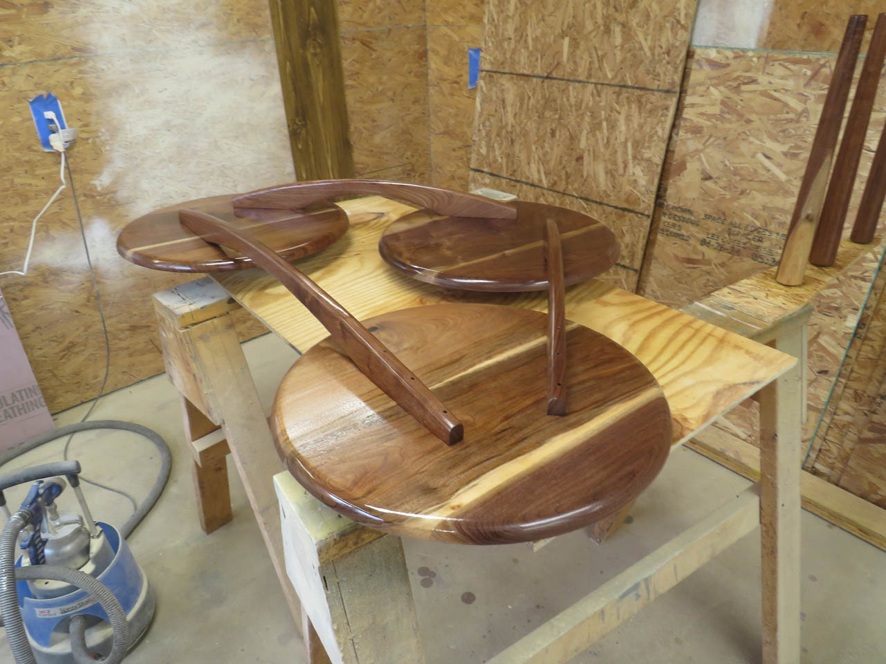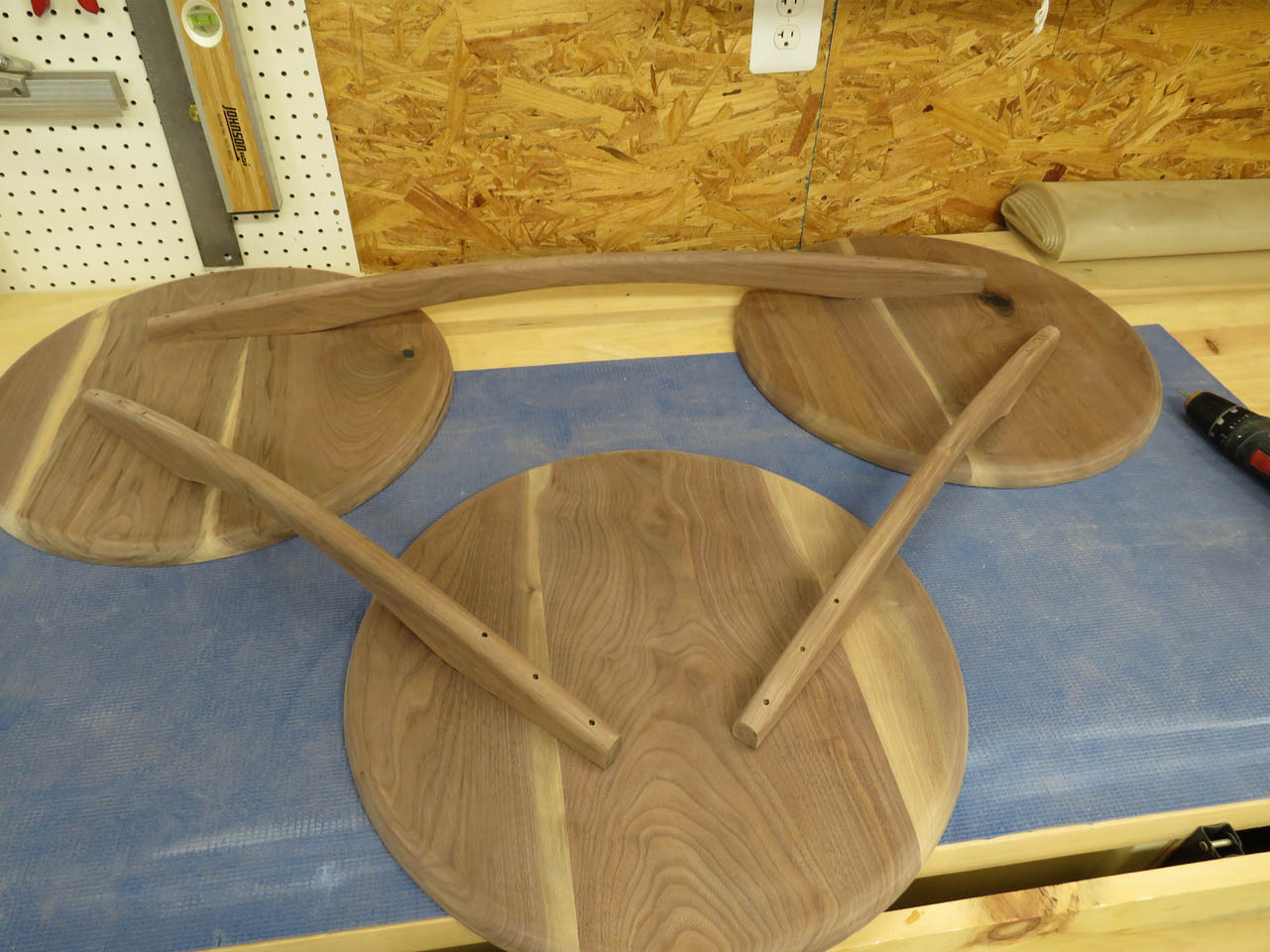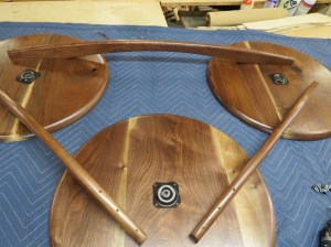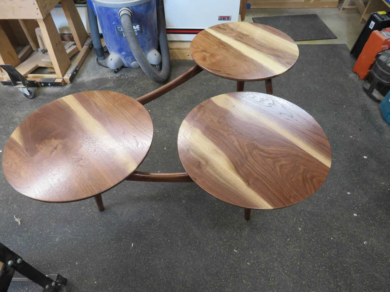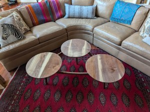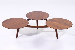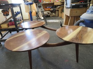 I have a client who asked me if I could build her a coffee table. She really liked the style of this mid-century modern coffee table that had three separate round tops with some interesting curved supports below. The one she found online was close to what she wanted but it was extremely overpriced as well as only 13″ tall.