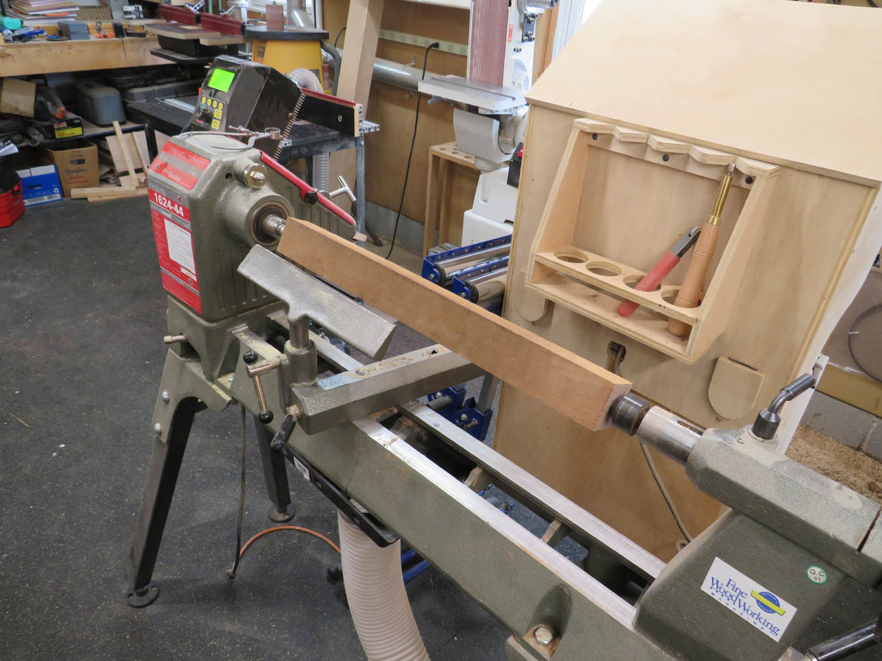 I cut some 2″ square stock, a couple inches longer than my final dimension, then placed it between my lathe centers.