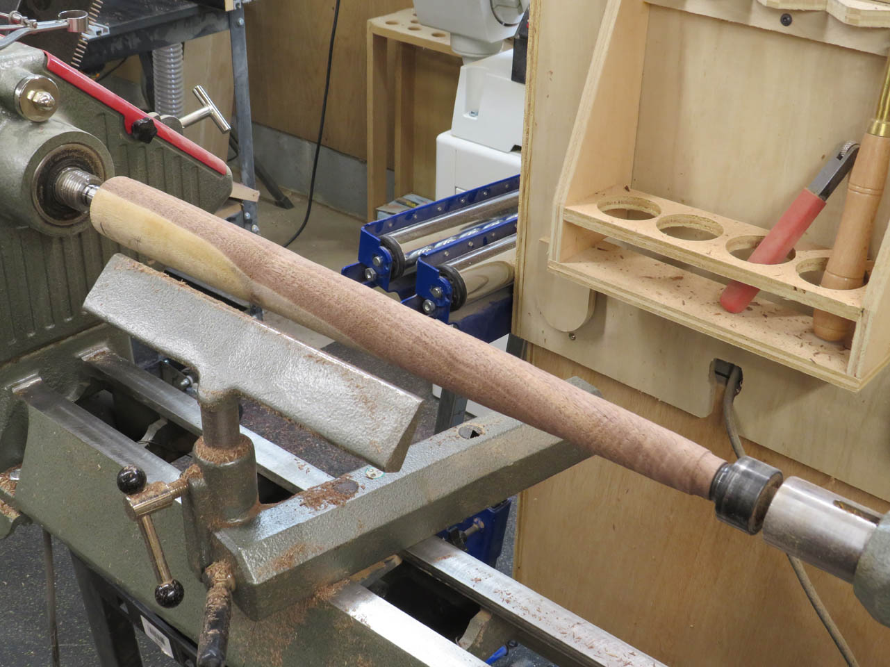 I got it as smooth as I could with the scraper, then slowed the lathe down and sanded the legs smooth.