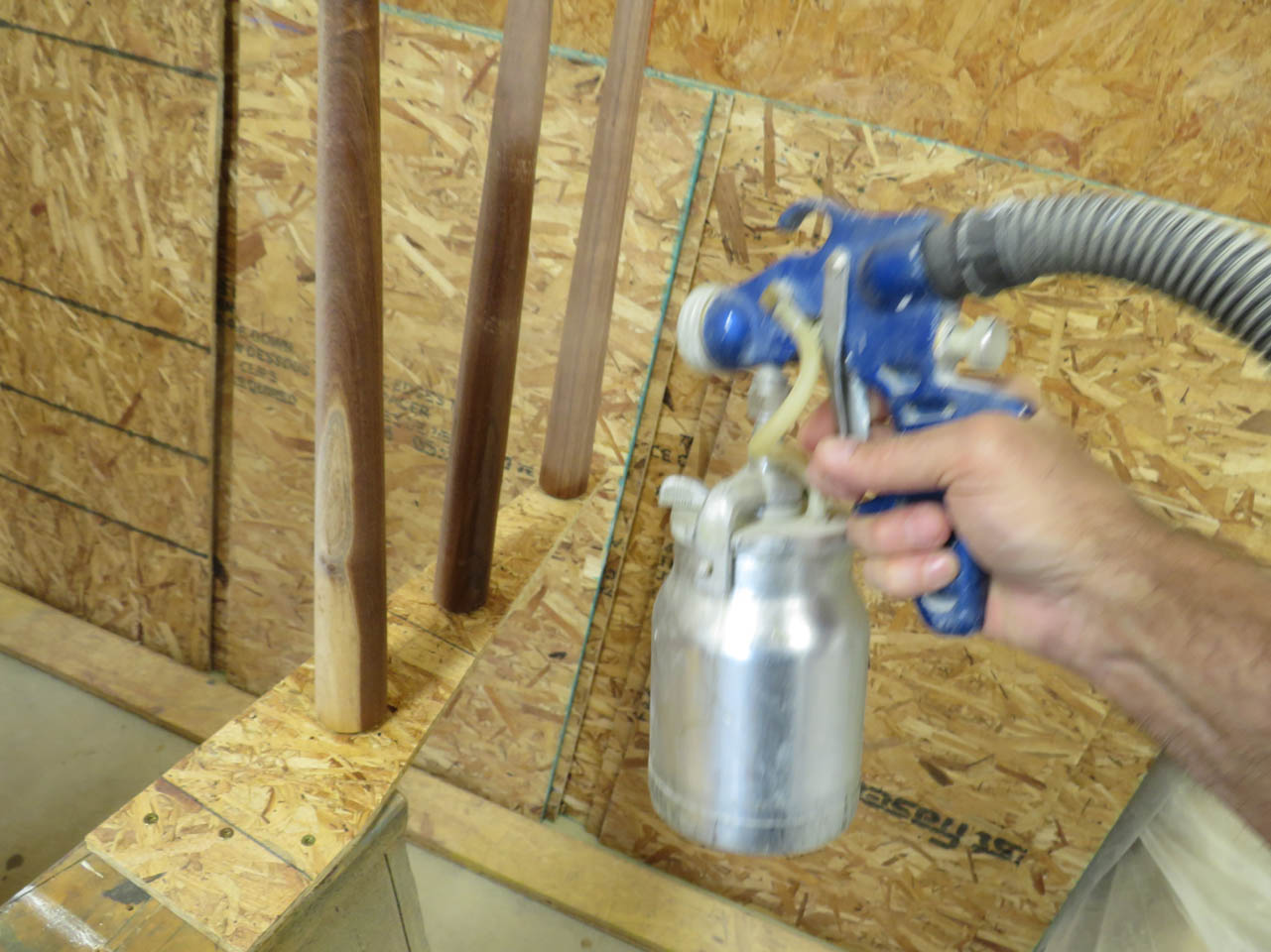 I drilled a small pilot hole at the center of the wide end, and screwed them to a board to hold them vertical for finishing.