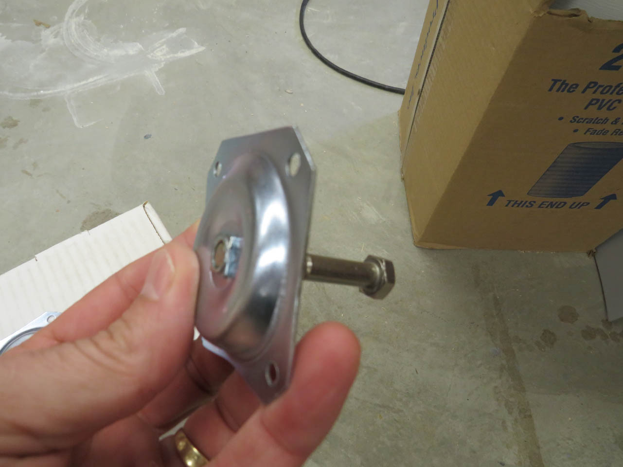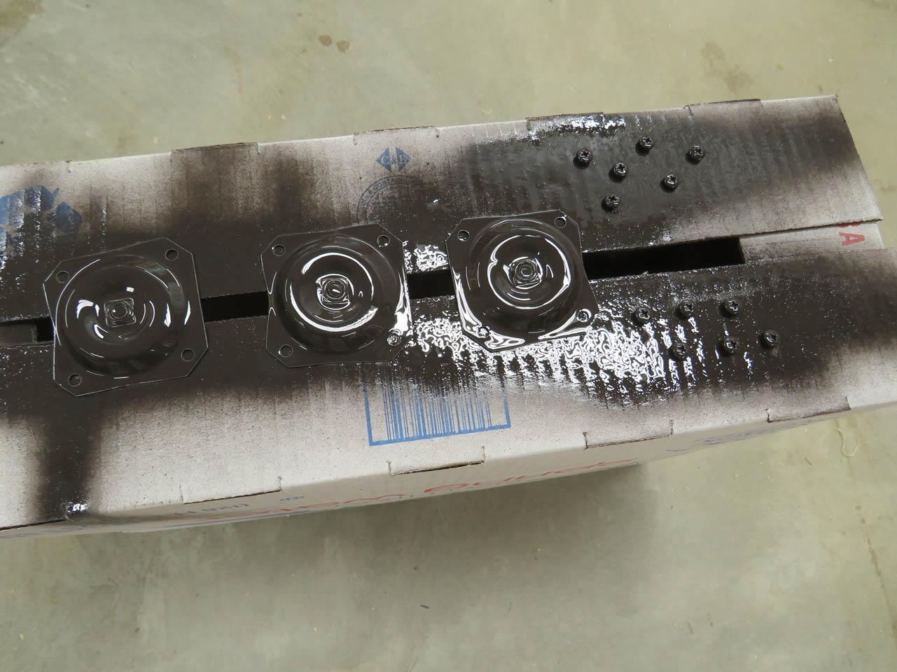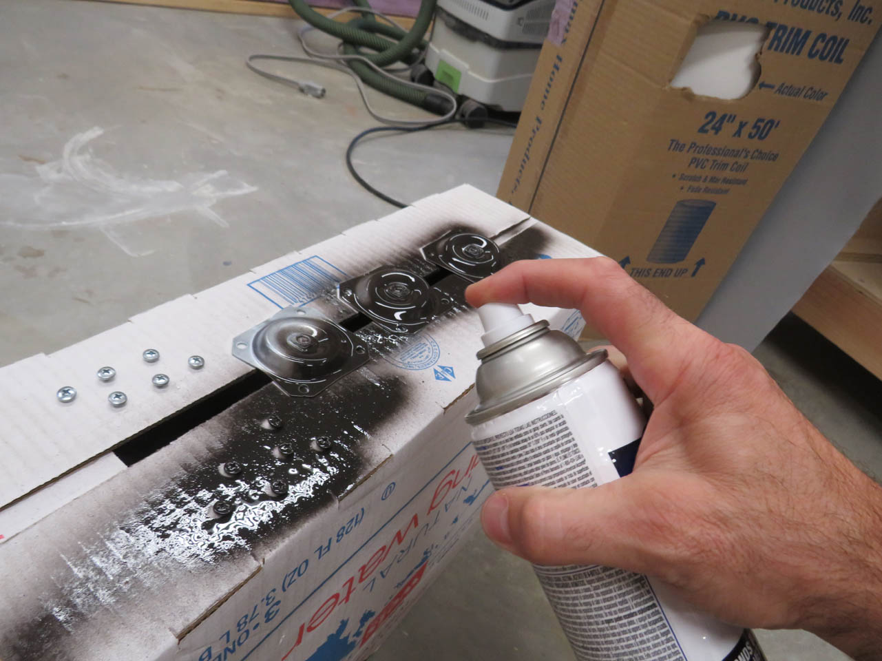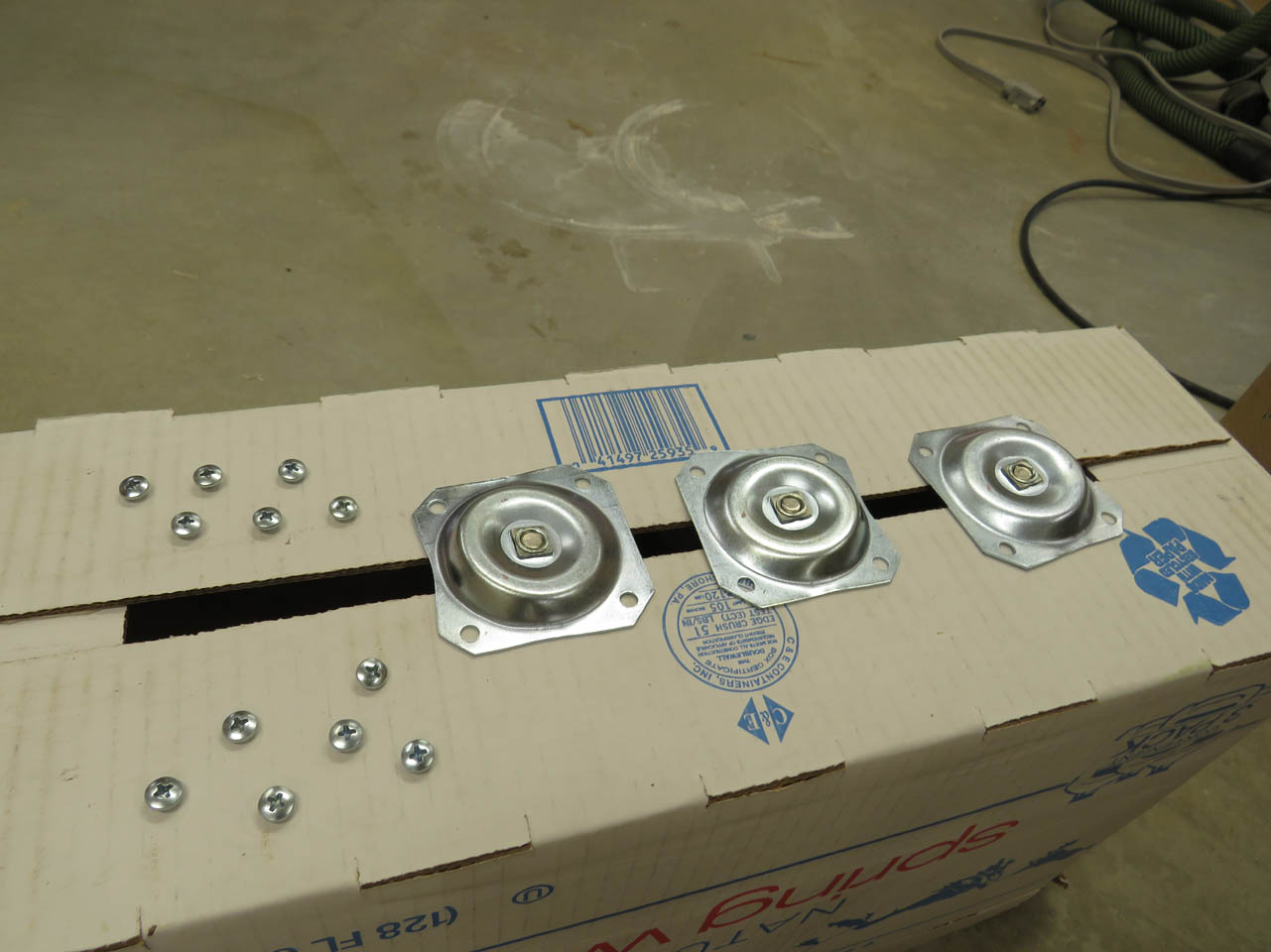 The mounting hardware finally arrived. I ordered three different sets before I found a set that was the right size and seemed durable enough. These actually have a nut welded in the center. The only problem is that I don’t like the shiny silver color. I placed a bolt in the threads and set the screws and brackets in the bottom of a cardboard box so that I can spray paint the exposed surfaces.