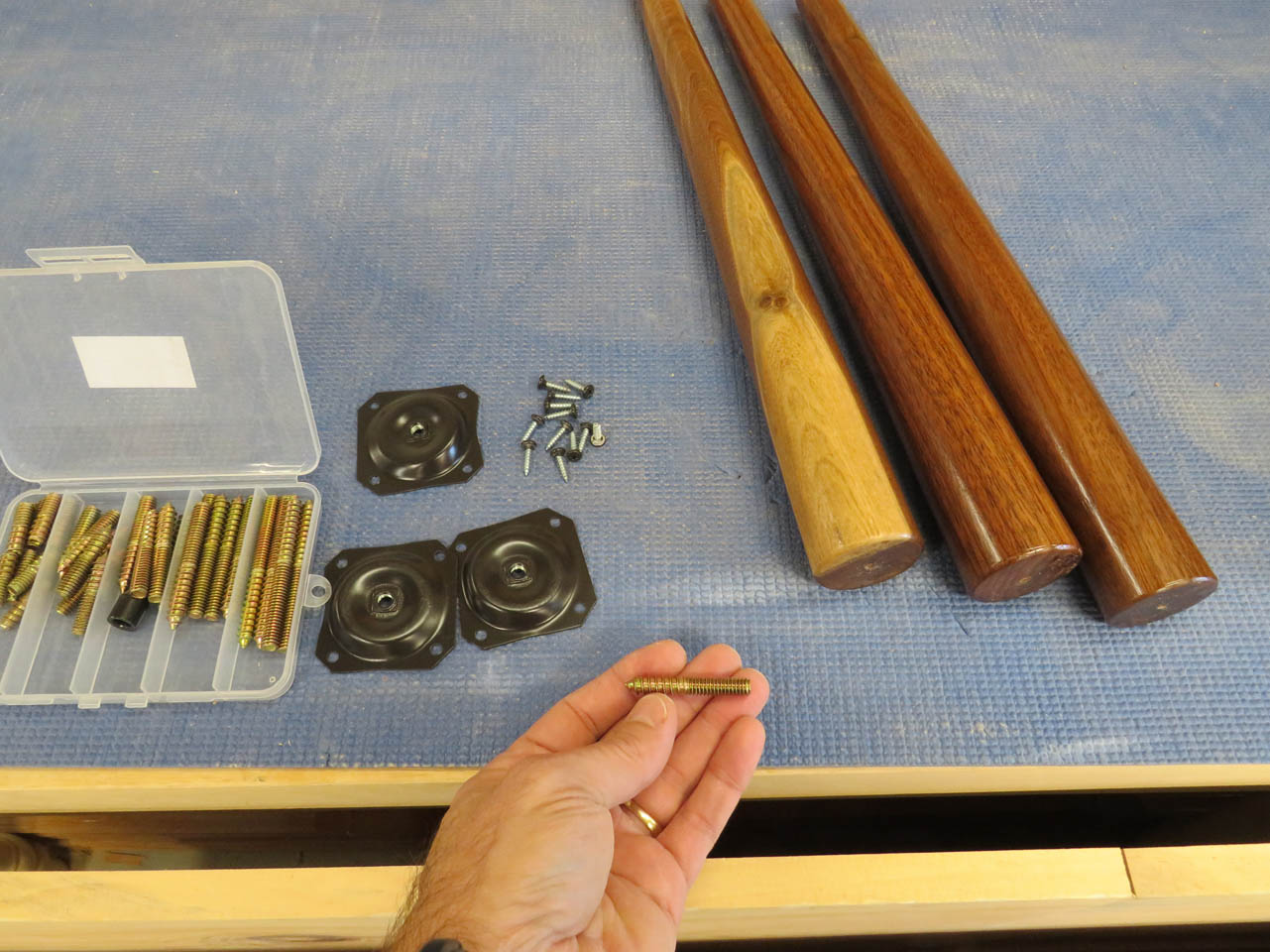 To attach the legs, I picked up an assortment of hanger bolts that have a machine thread on one half and a wood thread on the other.