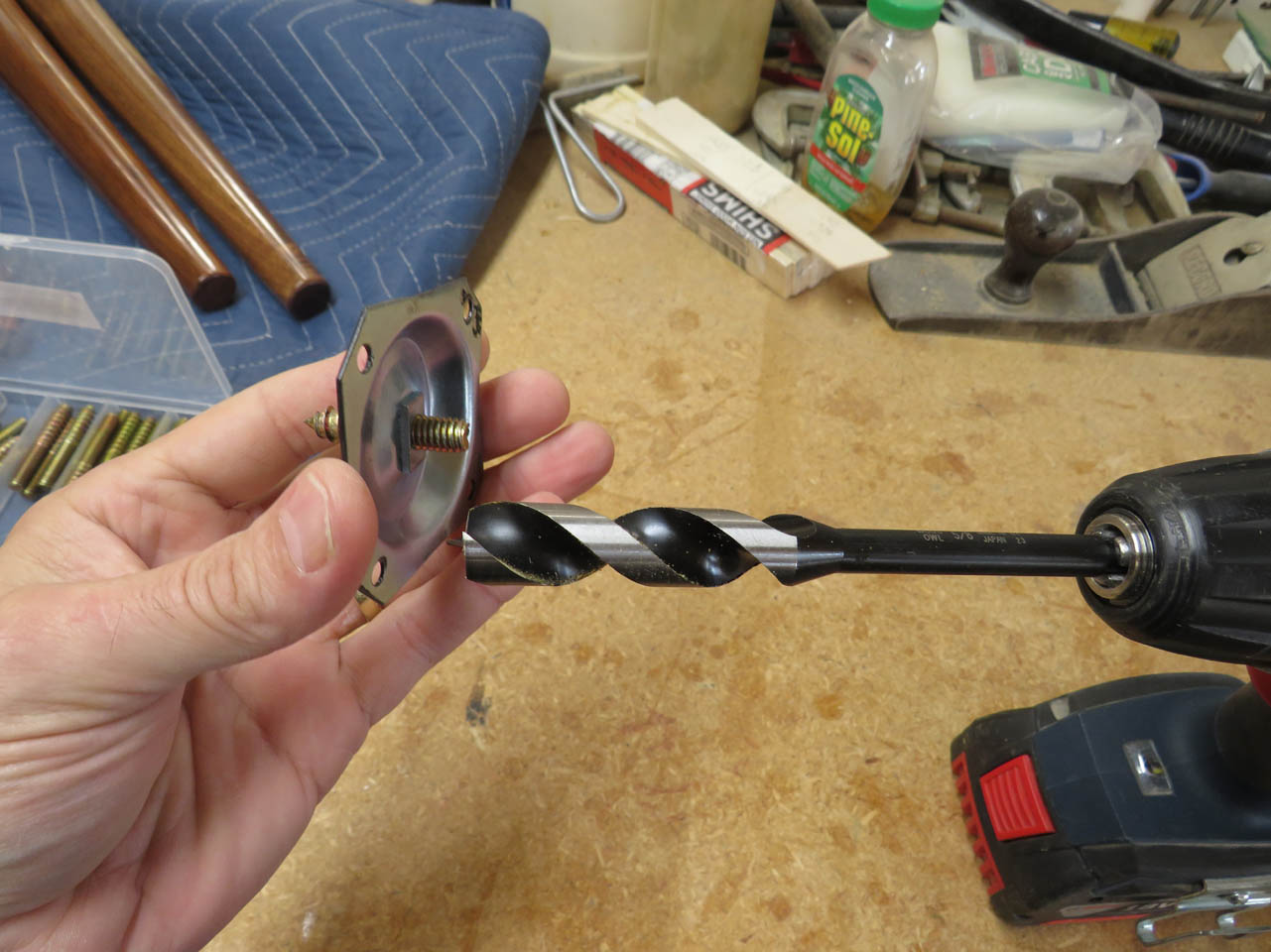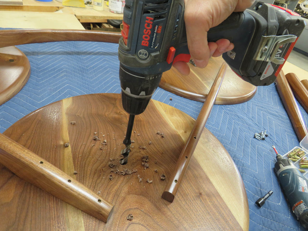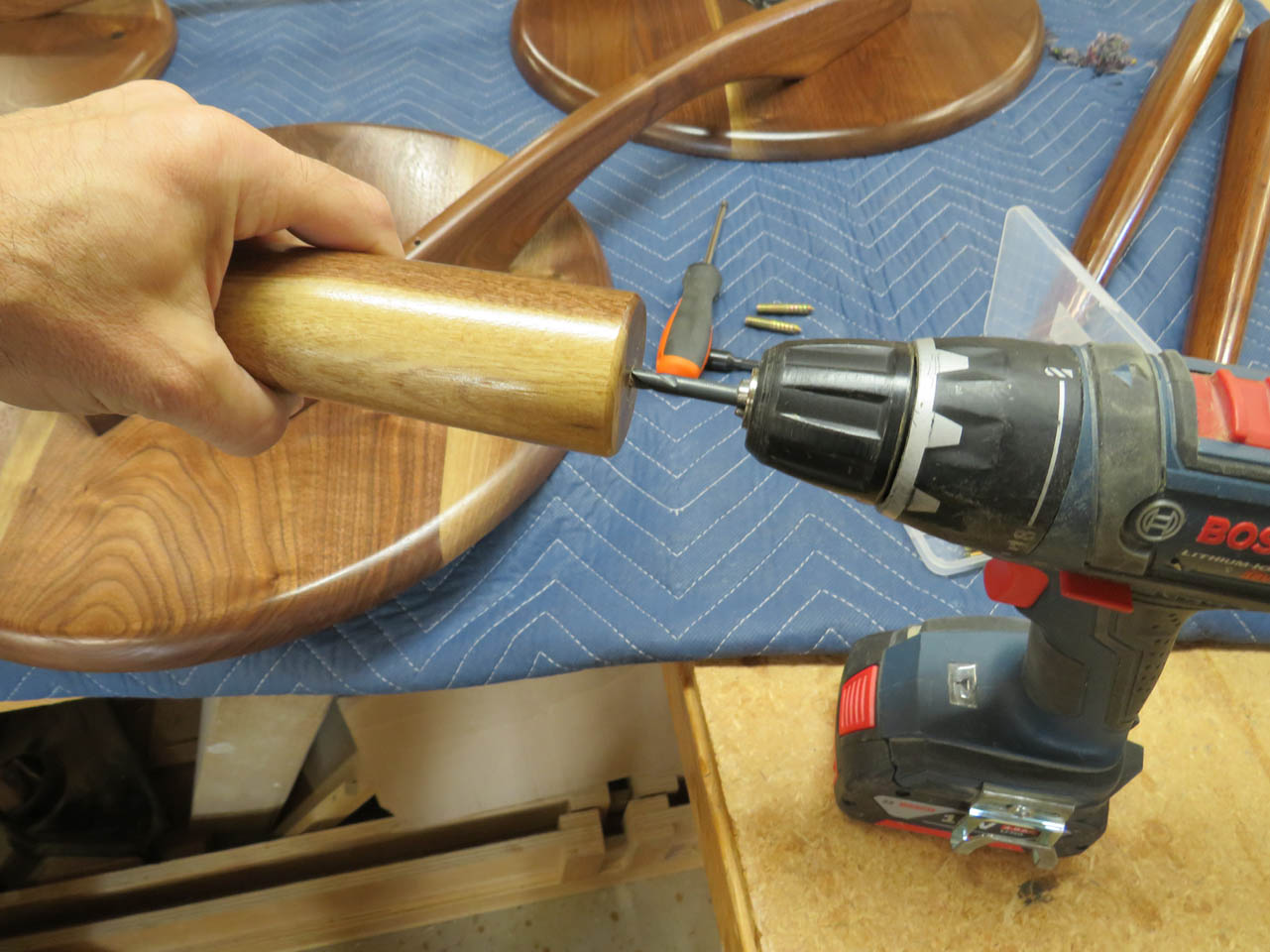 I also drilled a hole down the center of each leg, at the wide end, to install the hanger bolts.